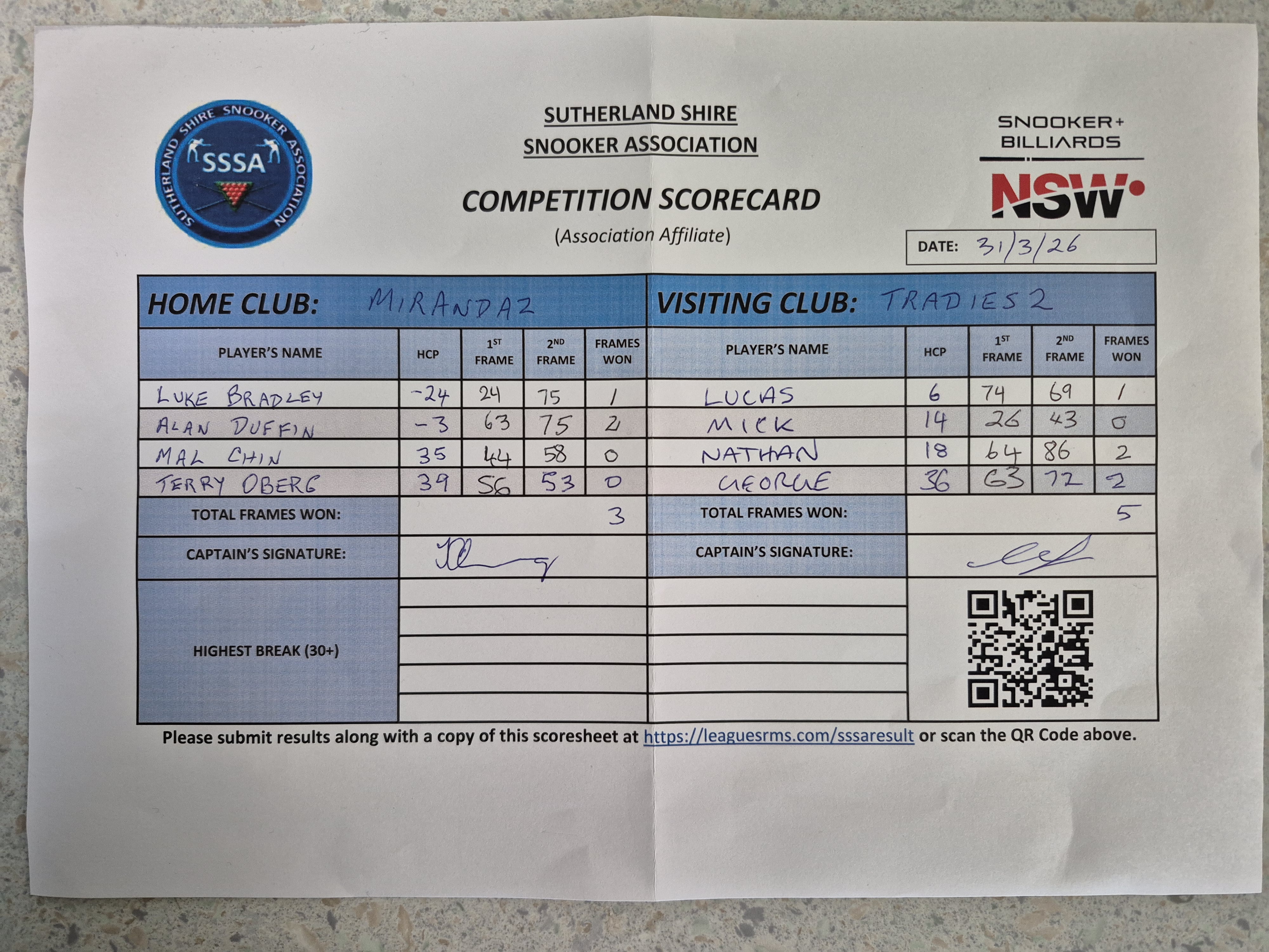 | POS | Miranda RSL #2 | 1st Frame | 2nd Frame | Frame Won | Break | Tradies #2 | 1st Frame | 2nd Frame | Frame Won | Break | Result Note |
