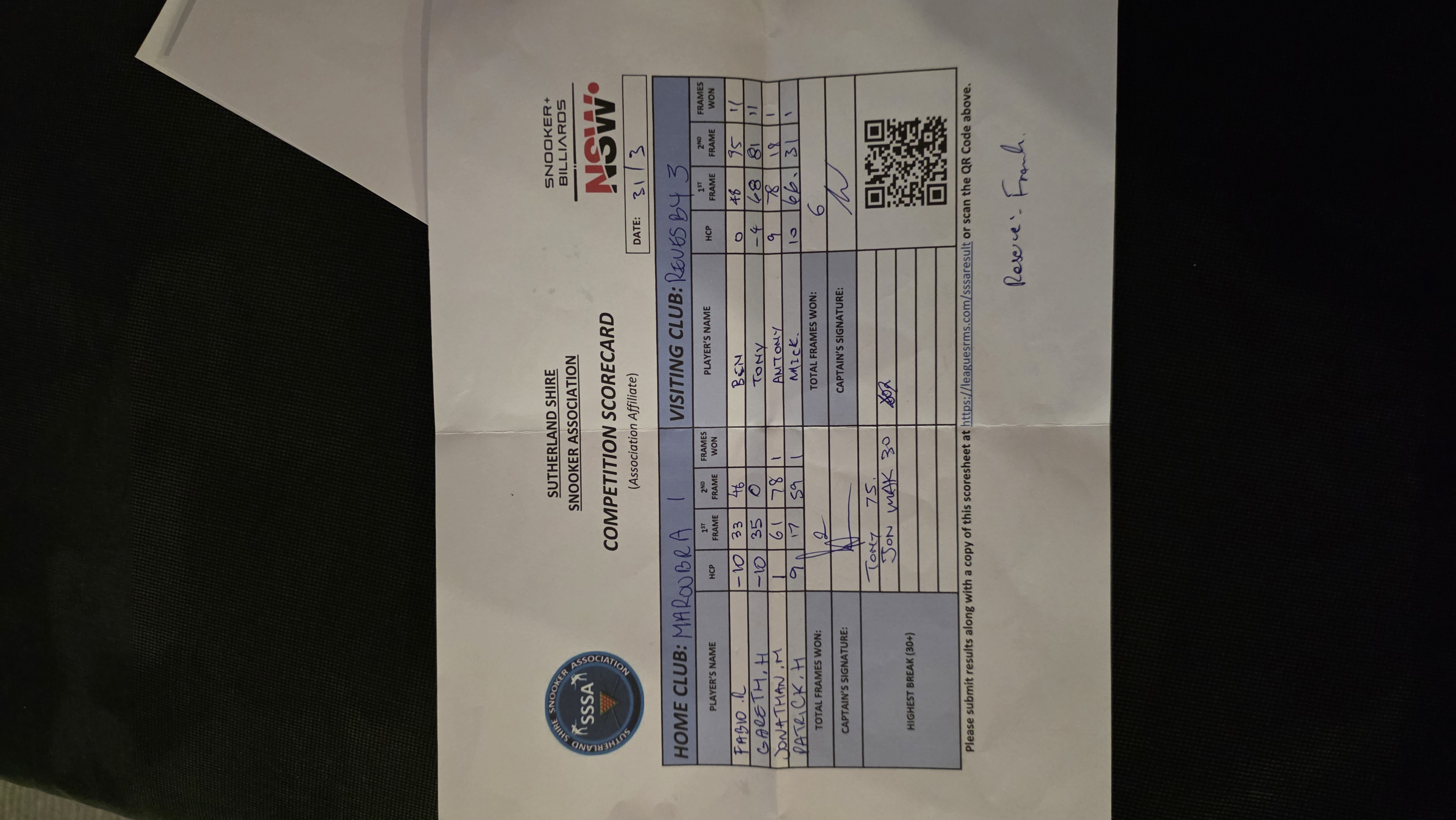 | POS | Maroubra Seals #1 | 1st Frame | 2nd Frame | Frame Won | Break | Revesby Workers #3 | 1st Frame | 2nd Frame | Frame Won | Break | Result Note |