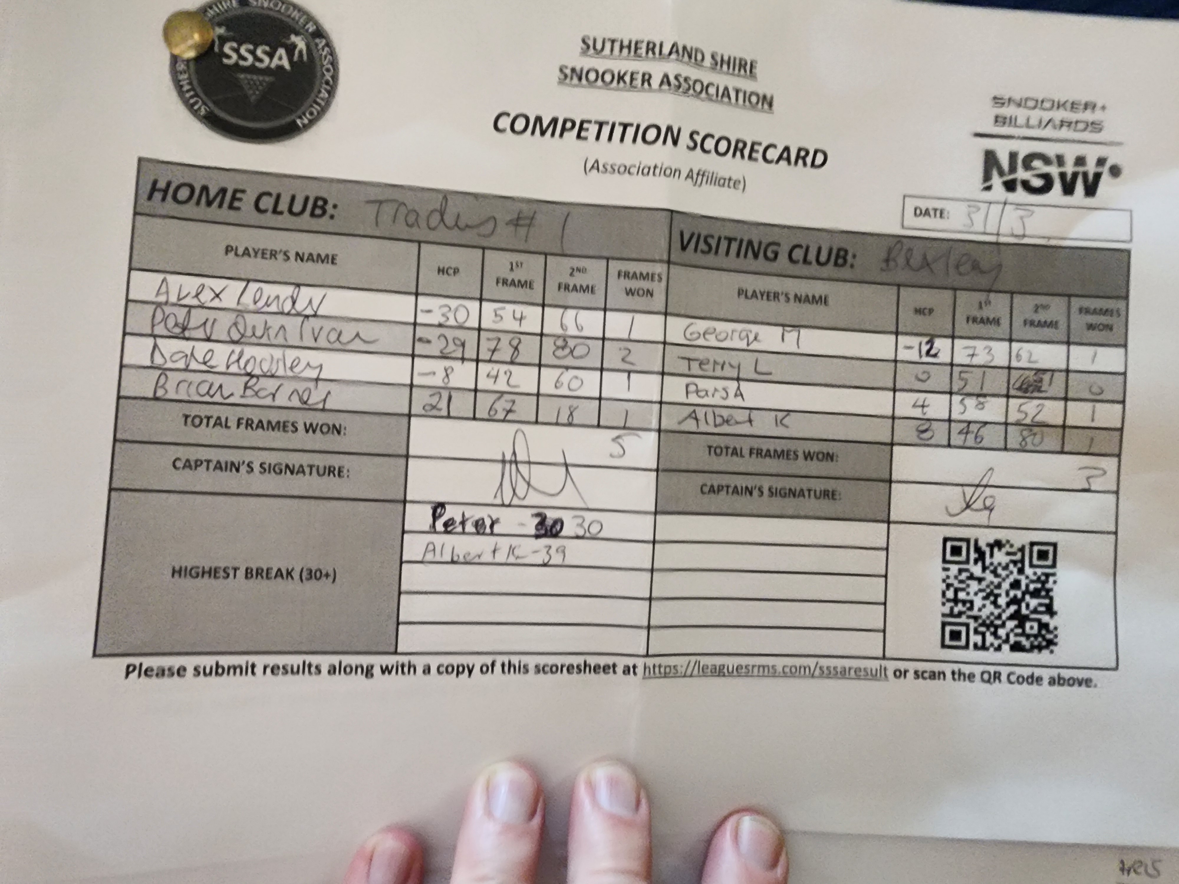 | POS | Tradies #1 | 1st Frame | 2nd Frame | Frame Won | Break | Bexley RSL #1 | 1st Frame | 2nd Frame | Frame Won | Break | Result Note |