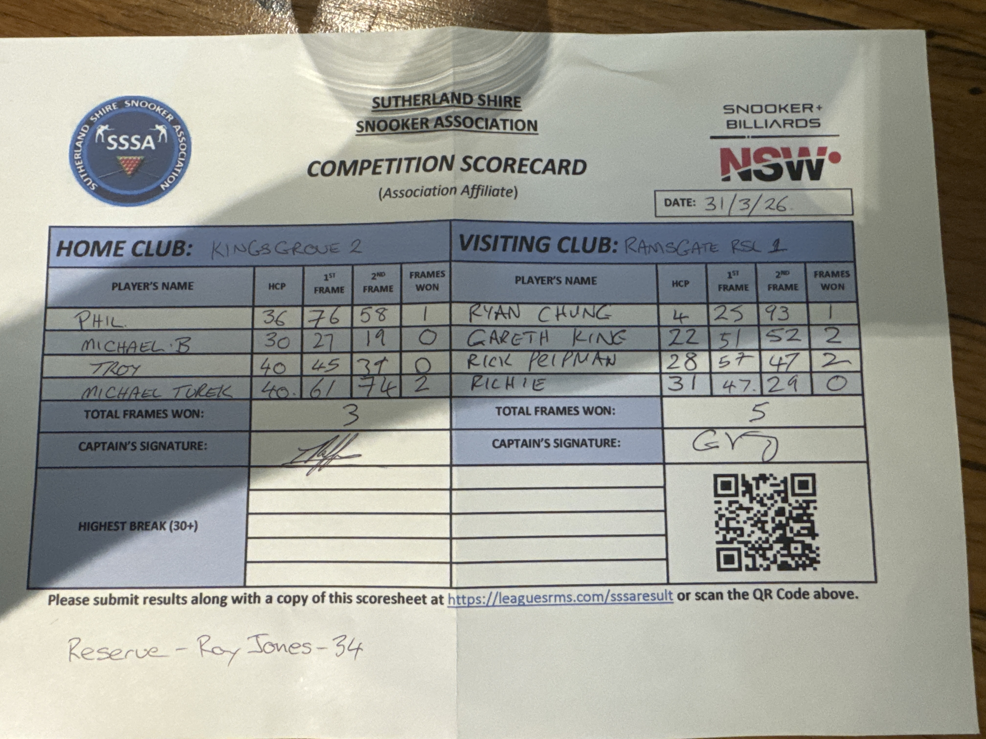 | POS | Kingsgrove #2 | 1st Frame | 2nd Frame | Frame Won | Break | Ramsgate RSL #1 | 1st Frame | 2nd Frame | Frame Won | Break | Result Note |