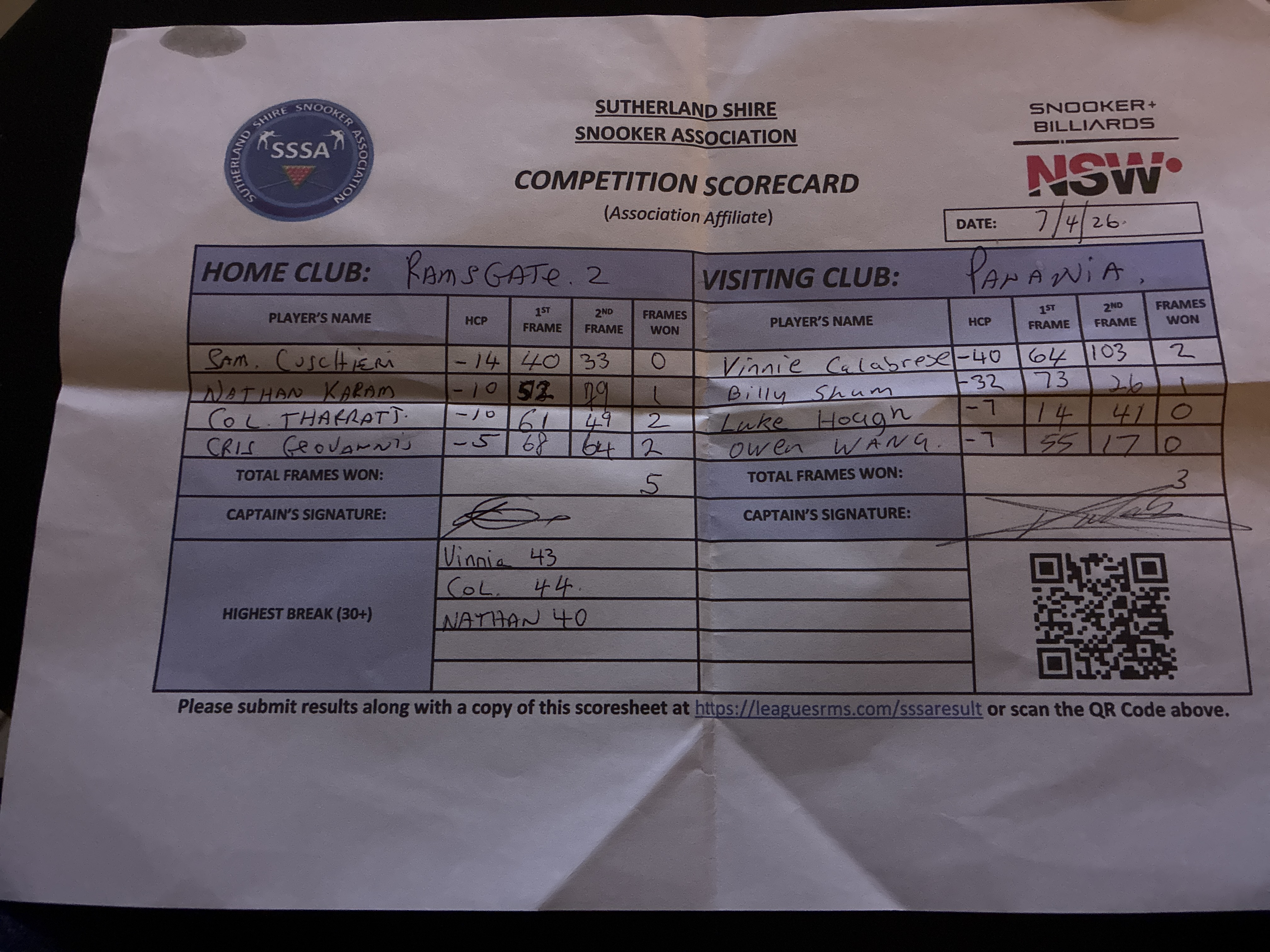 | POS | Ramsgate RSL #2 | 1st Frame | 2nd Frame | Frame Won | Break | Panania Diggers #1 | 1st Frame | 2nd Frame | Frame Won | Break | Result Note |
