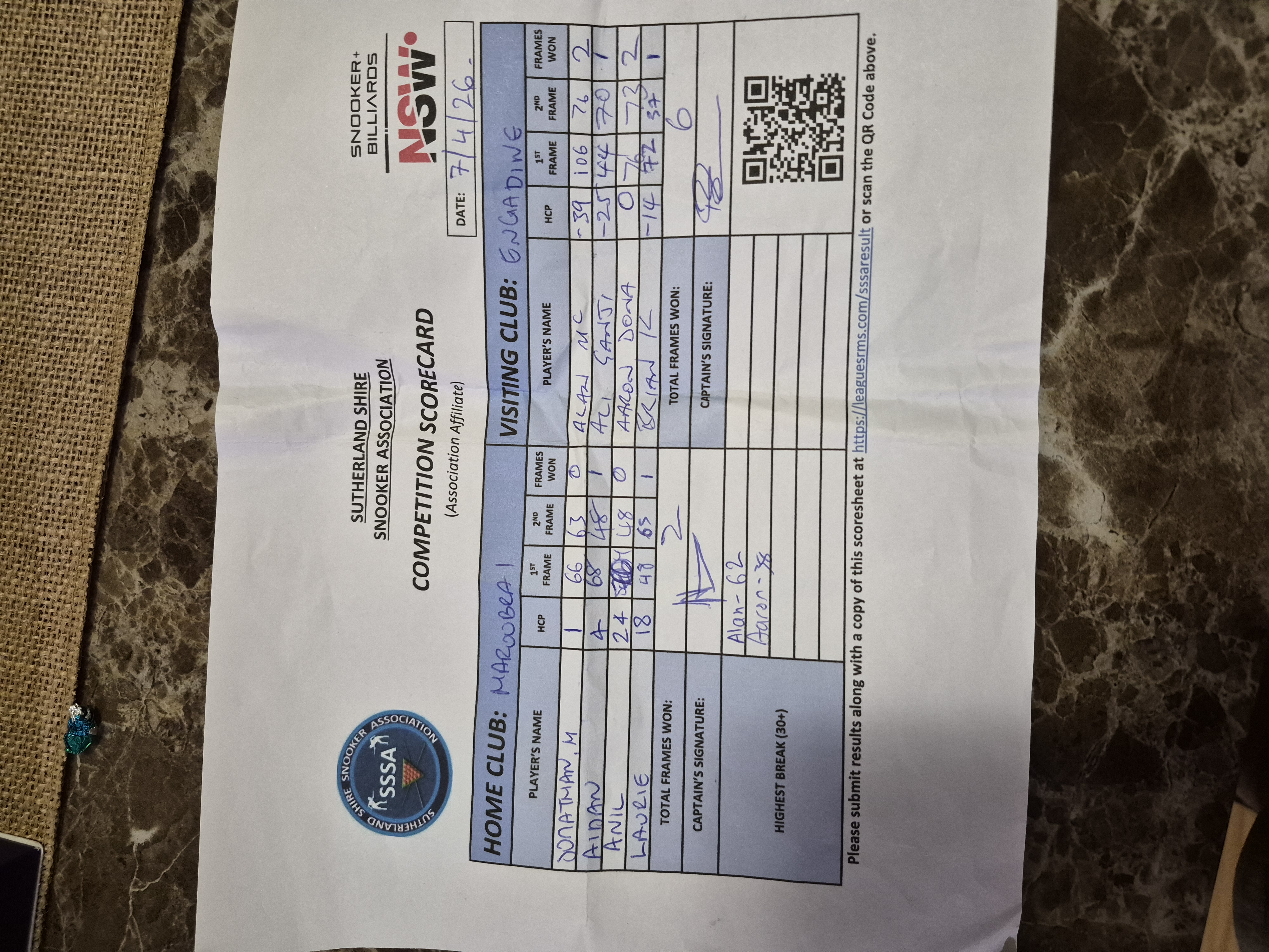 | POS | Maroubra Seals #1 | 1st Frame | 2nd Frame | Frame Won | Break | Engadine #1 | 1st Frame | 2nd Frame | Frame Won | Break | Result Note |