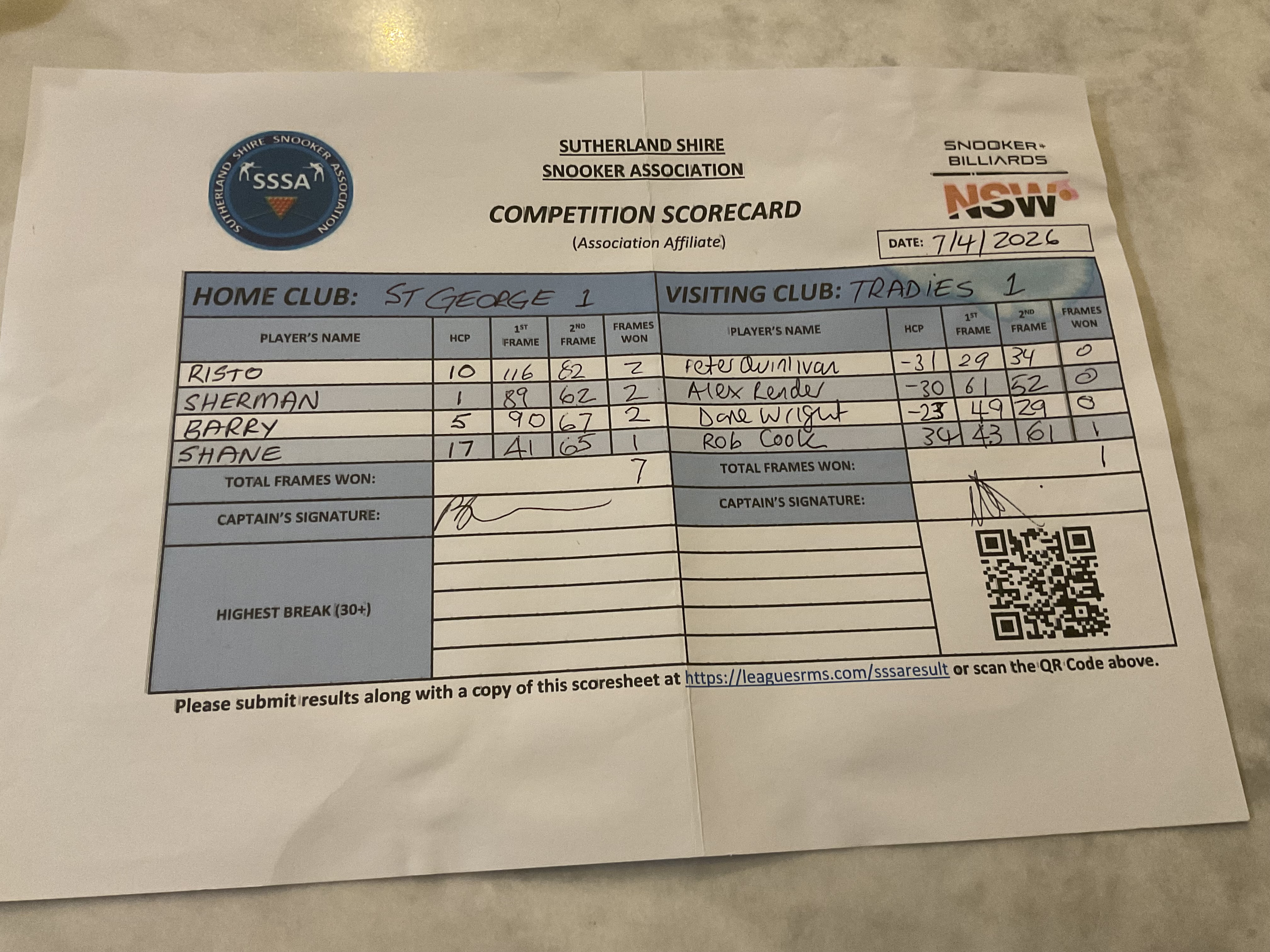 | POS | St George #1 | 1st Frame | 2nd Frame | Frame Won | Break | Tradies #1 | 1st Frame | 2nd Frame | Frame Won | Break | Result Note |