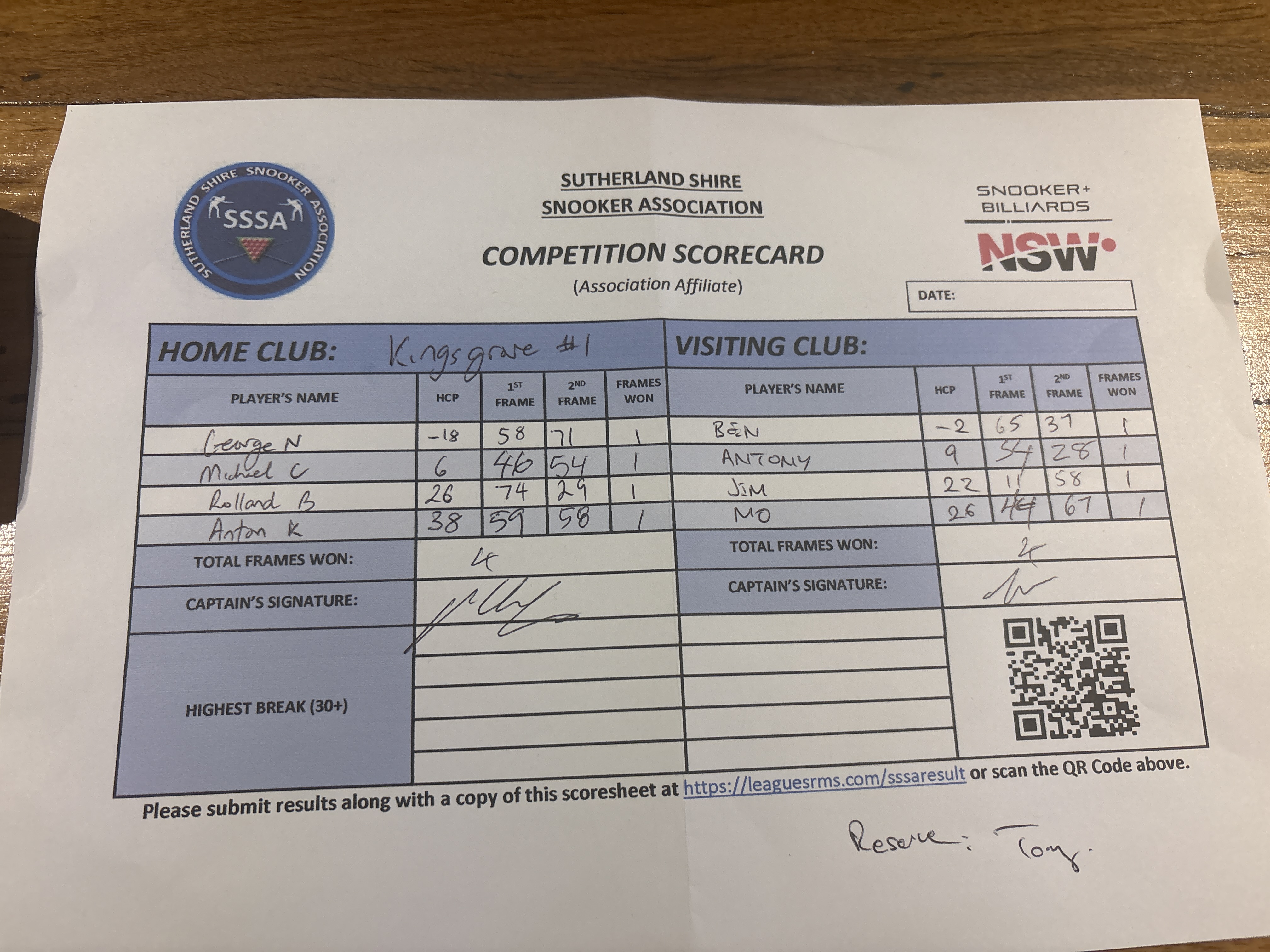 | POS | Kingsgrove #1 | 1st Frame | 2nd Frame | Frame Won | Break | Revesby Workers #3 | 1st Frame | 2nd Frame | Frame Won | Break | Result Note |