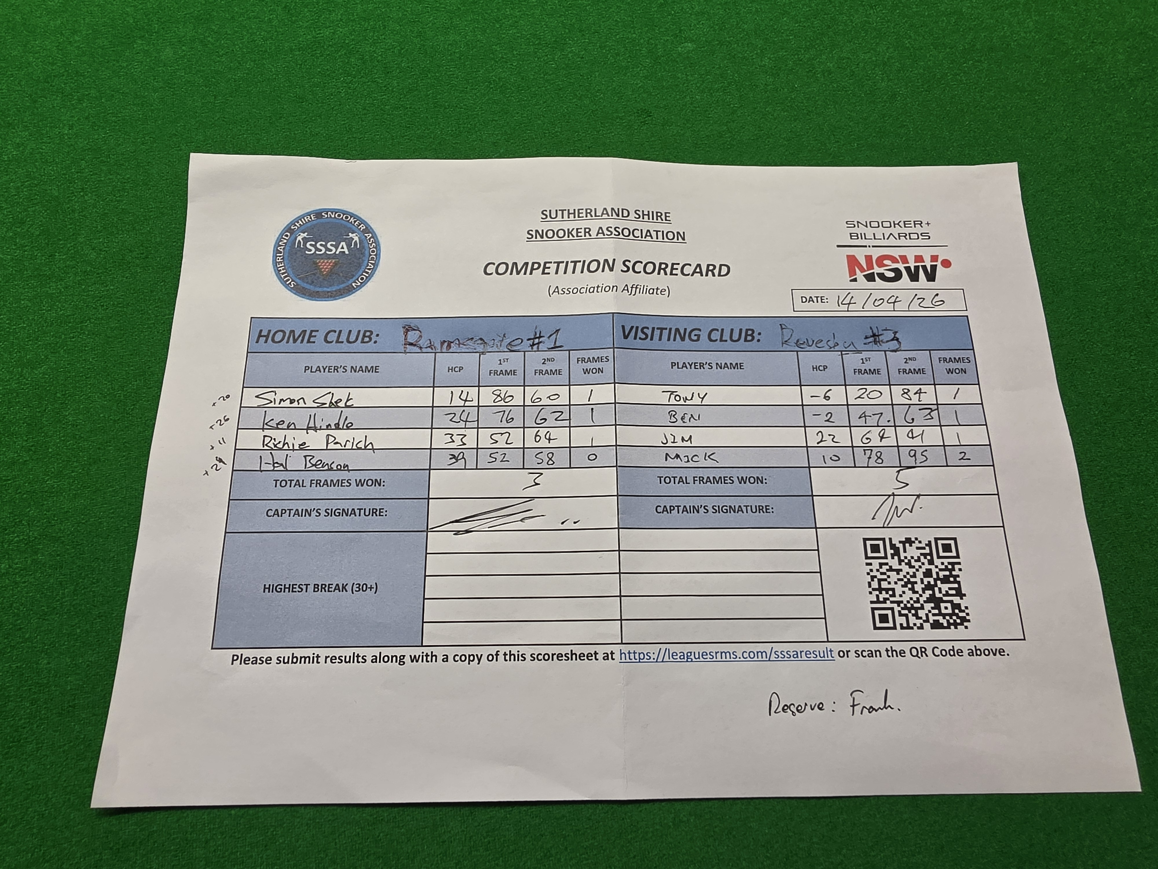 | POS | Ramsgate RSL #1 | 1st Frame | 2nd Frame | Frame Won | Break | Revesby Workers #3 | 1st Frame | 2nd Frame | Frame Won | Break | Result Note |