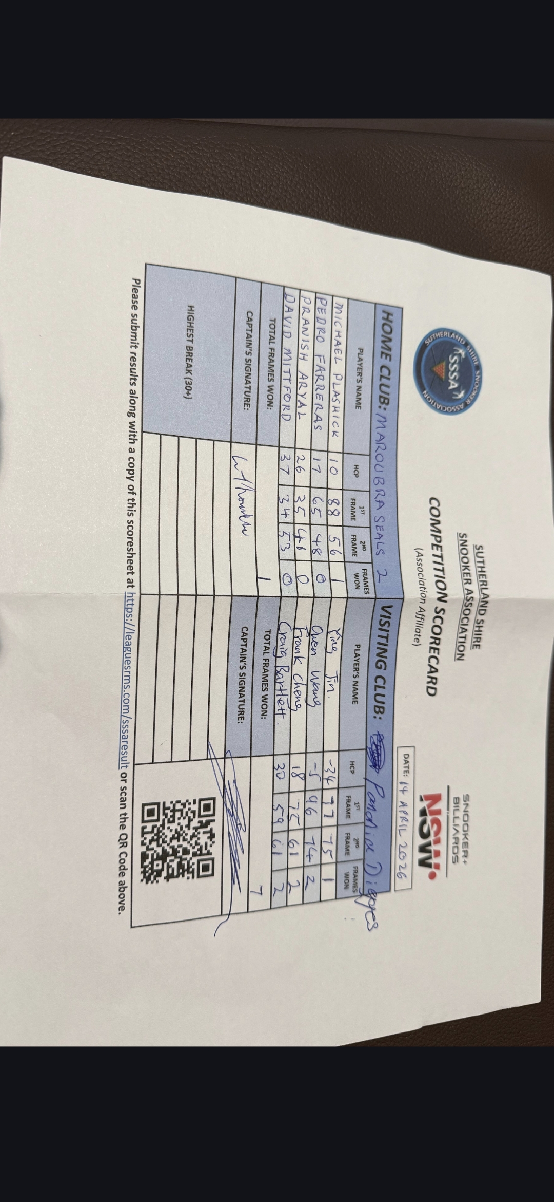 | POS | Maroubra Seals #2 | 1st Frame | 2nd Frame | Frame Won | Break | Panania Diggers #1 | 1st Frame | 2nd Frame | Frame Won | Break | Result Note |