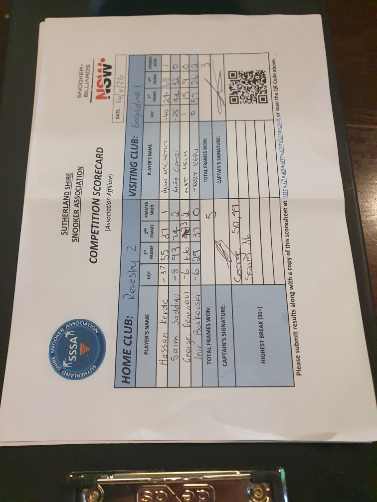 | POS | Revesby Workers #2 | 1st Frame | 2nd Frame | Frame Won | Break | Engadine #1 | 1st Frame | 2nd Frame | Frame Won | Break | Result Note |