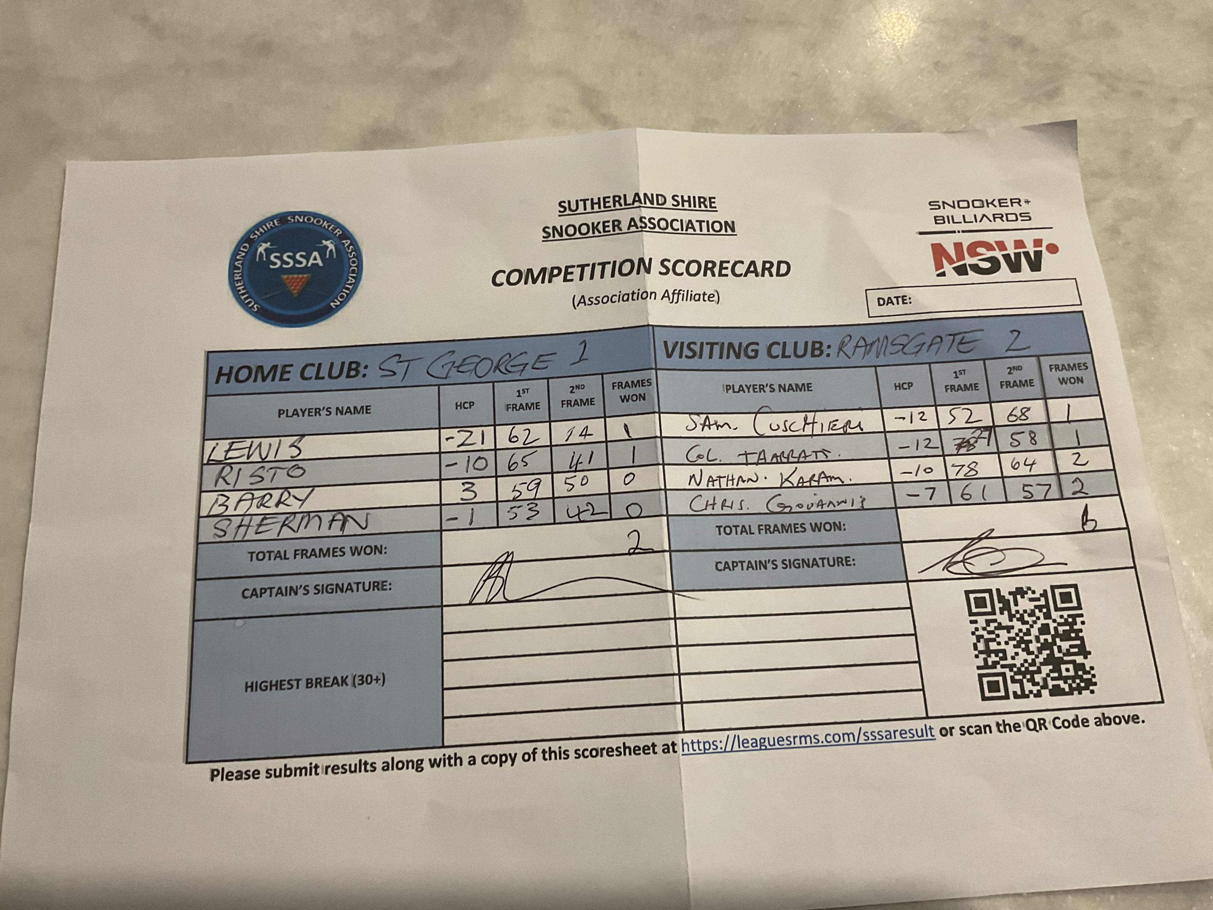 | POS | St George #1 | 1st Frame | 2nd Frame | Frame Won | Break | Ramsgate RSL #2 | 1st Frame | 2nd Frame | Frame Won | Break | Result Note |