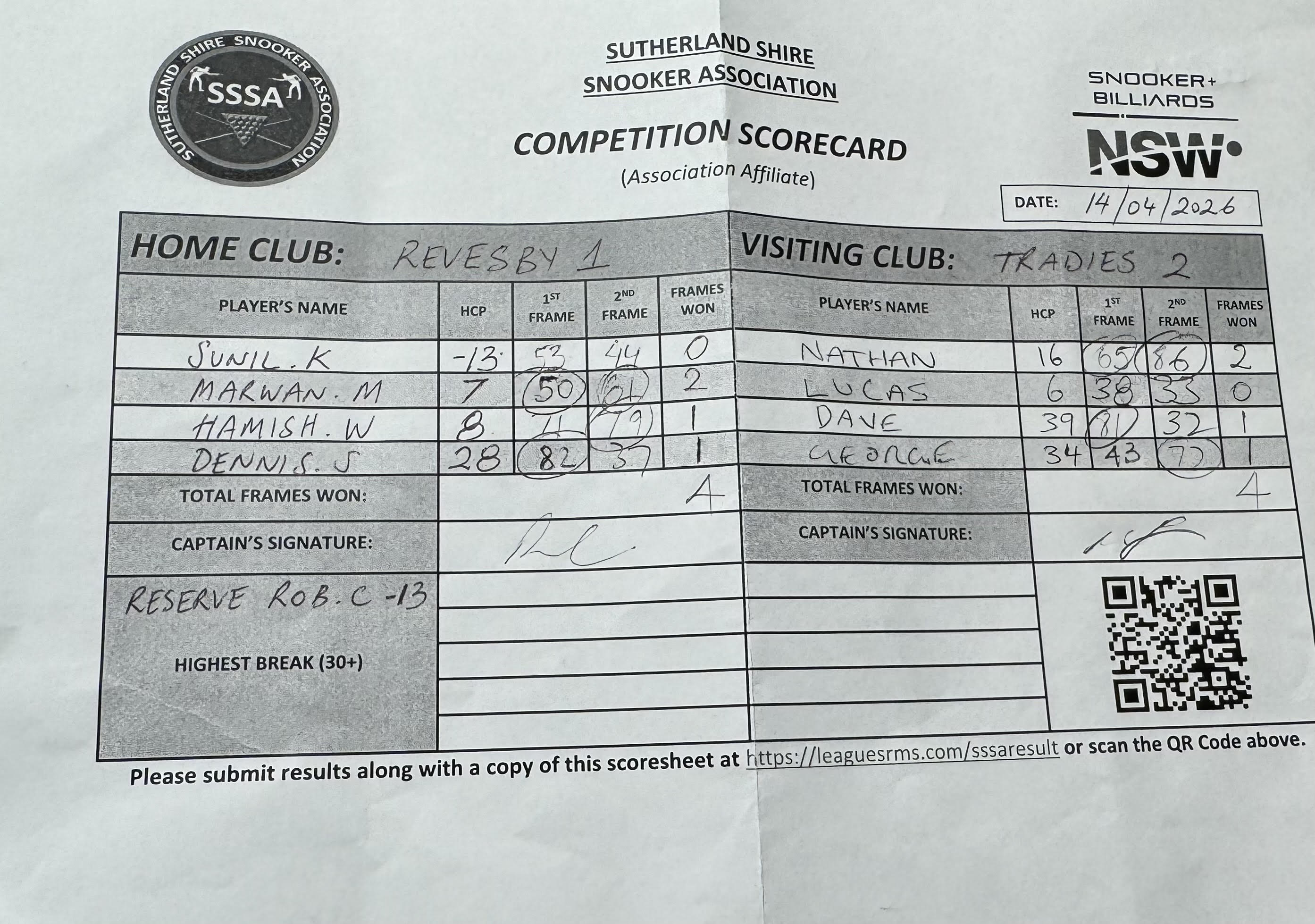 | POS | Revesby Workers #1 | 1st Frame | 2nd Frame | Frame Won | Break | Tradies #2 | 1st Frame | 2nd Frame | Frame Won | Break | Result Note |