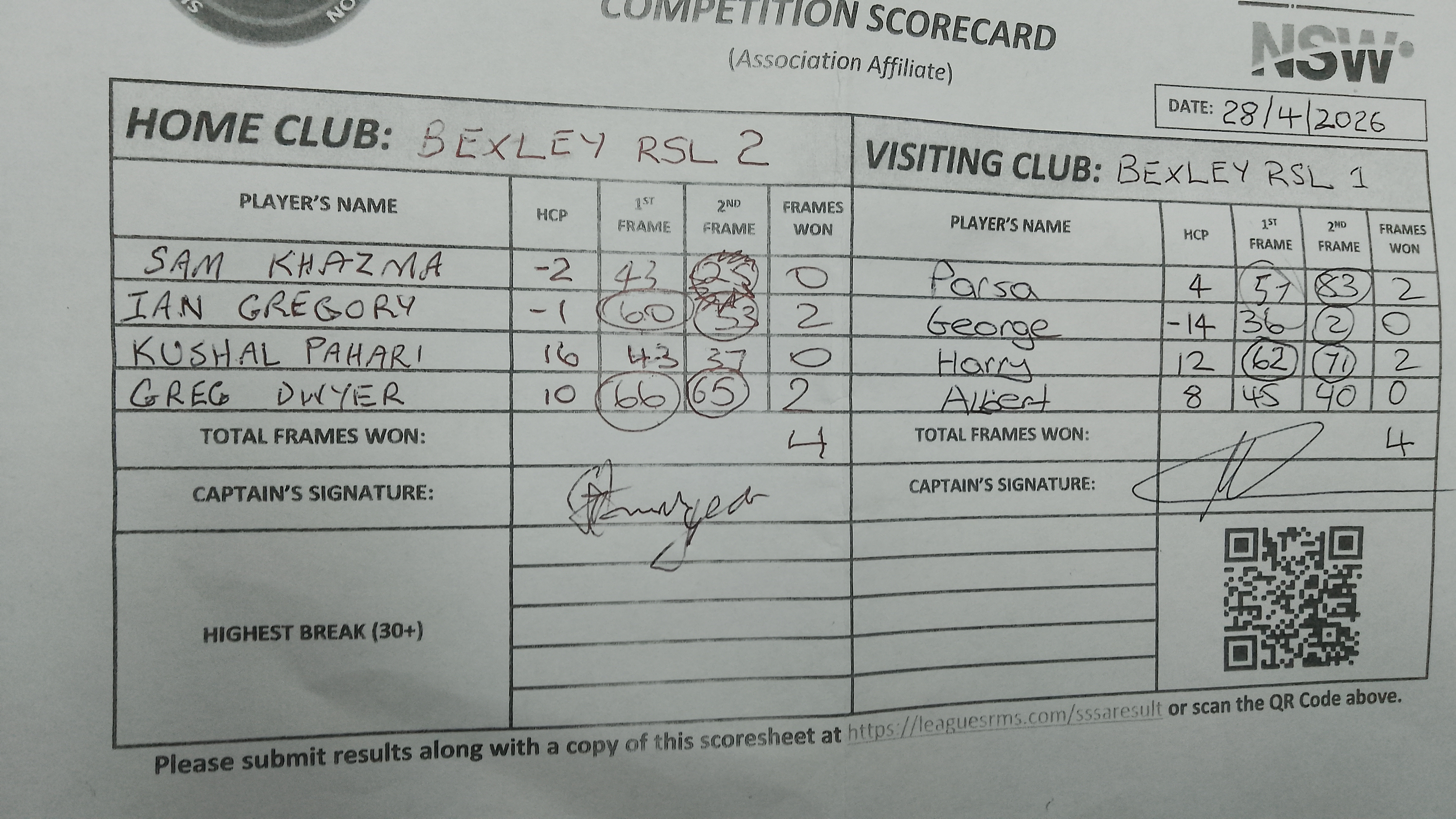 | POS | Bexley RSL #2 | 1st Frame | 2nd Frame | Frame Won | Break | Bexley RSL #1 | 1st Frame | 2nd Frame | Frame Won | Break | Result Note |