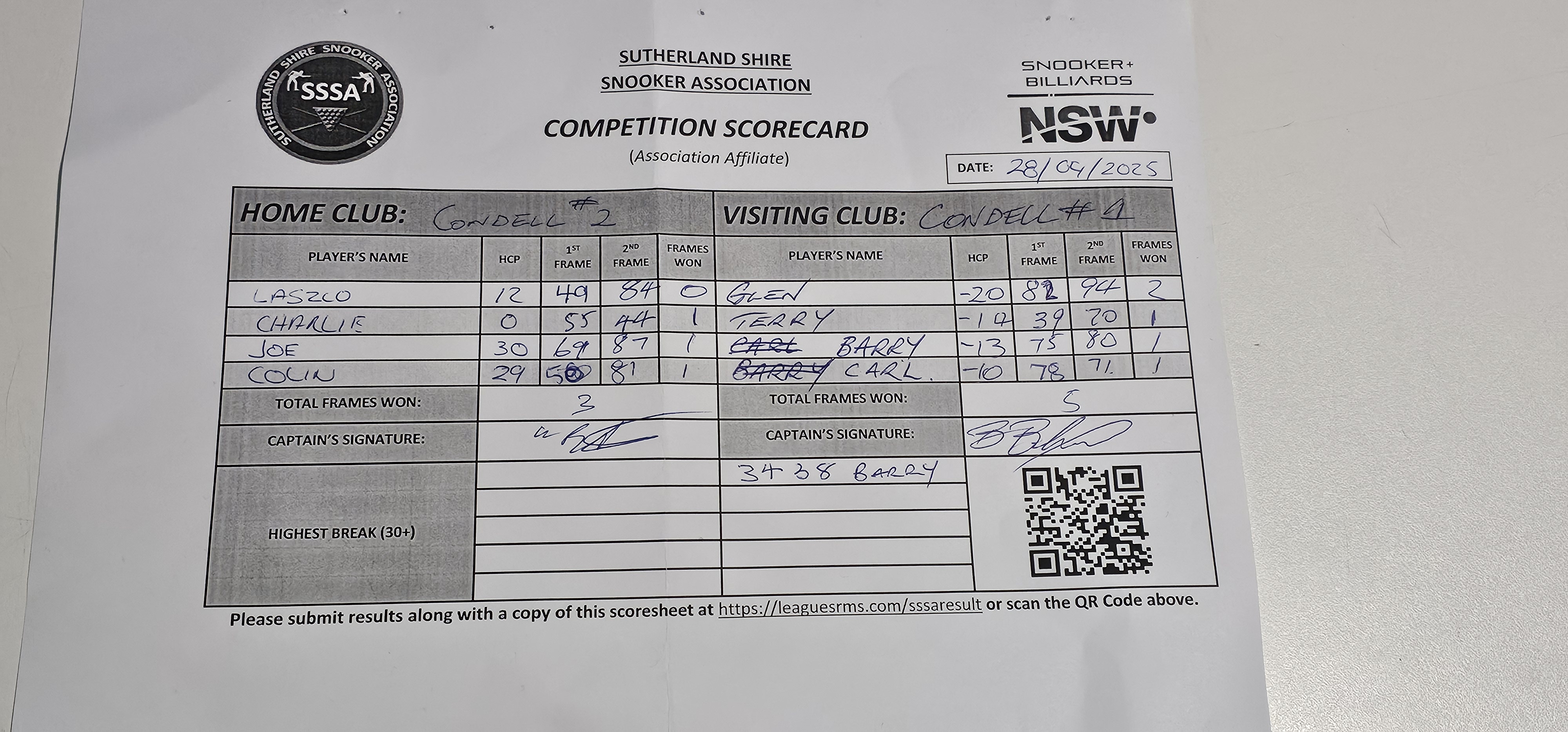 | POS | Condell Park #2 | 1st Frame | 2nd Frame | Frame Won | Break | Condell Park #1 | 1st Frame | 2nd Frame | Frame Won | Break | Result Note |