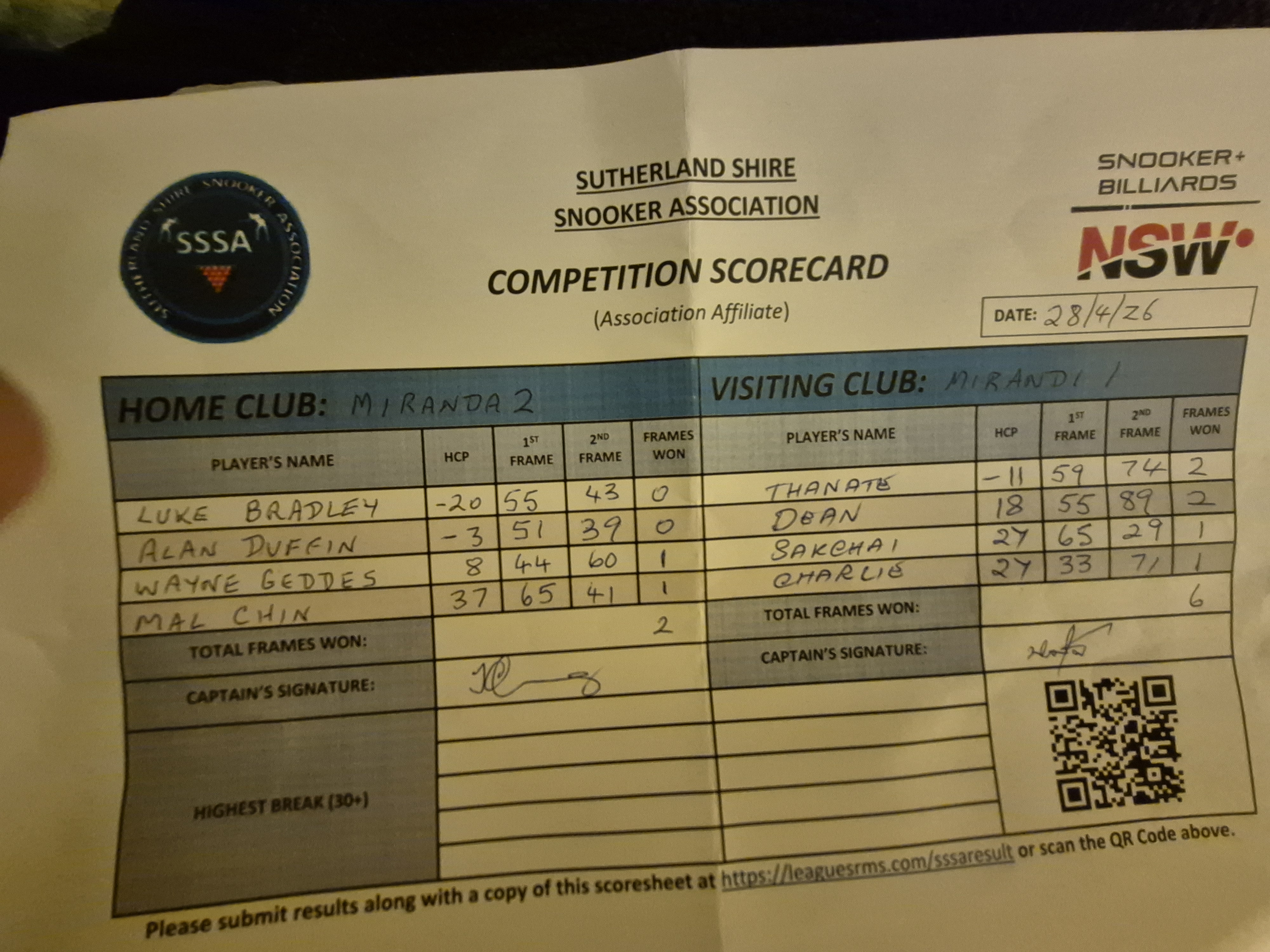 | POS | Miranda RSL #2 | 1st Frame | 2nd Frame | Frame Won | Break | Miranda RSL #1 | 1st Frame | 2nd Frame | Frame Won | Break | Result Note |