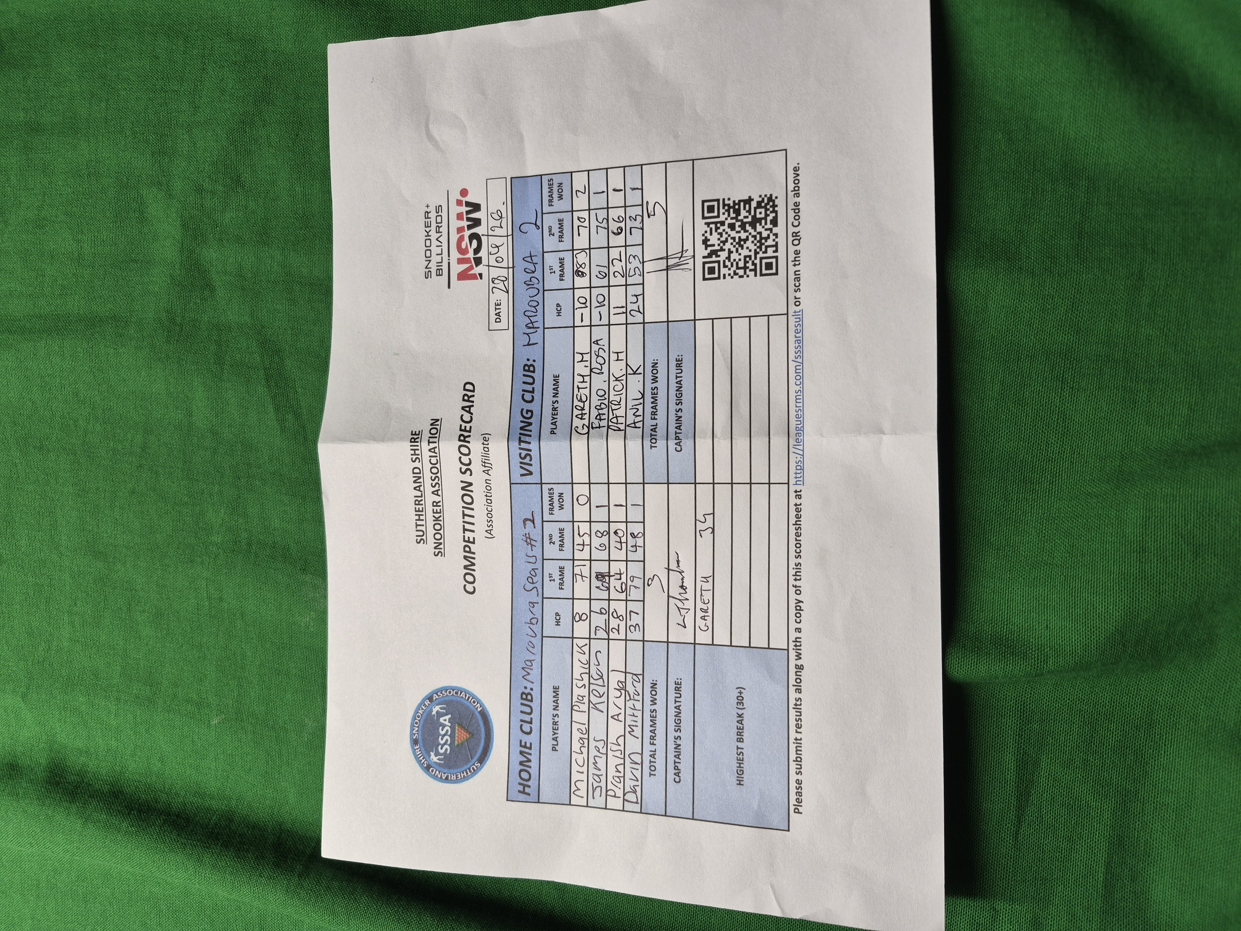 | POS | Maroubra Seals #2 | 1st Frame | 2nd Frame | Frame Won | Break | Maroubra Seals #1 | 1st Frame | 2nd Frame | Frame Won | Break | Result Note |