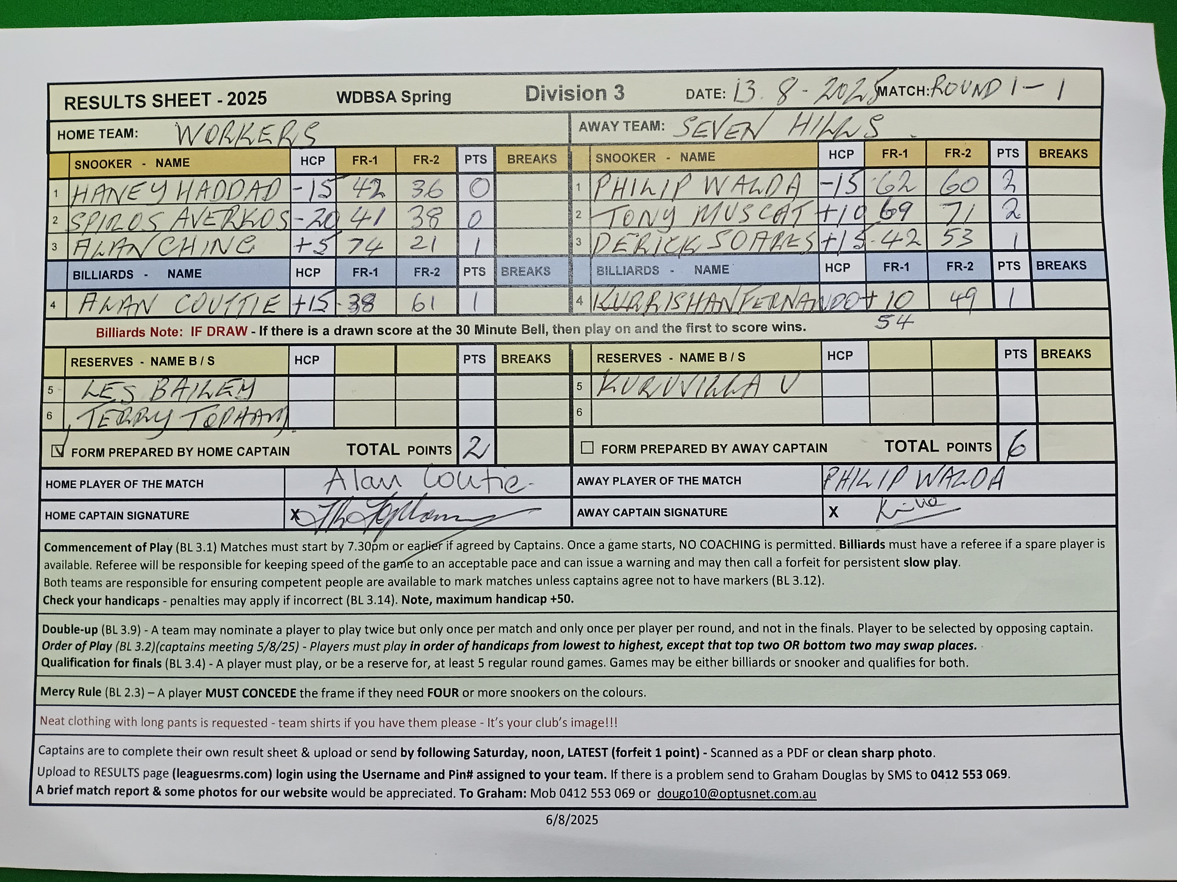 | POS | Workers | Frame 1 | Net | Frame 2 | Net | PTS | Breaks | Seven Hills | Frame 1 | Net | Frame 2 | Net | PTS | Breaks | Result Note | Updated on | Update by |