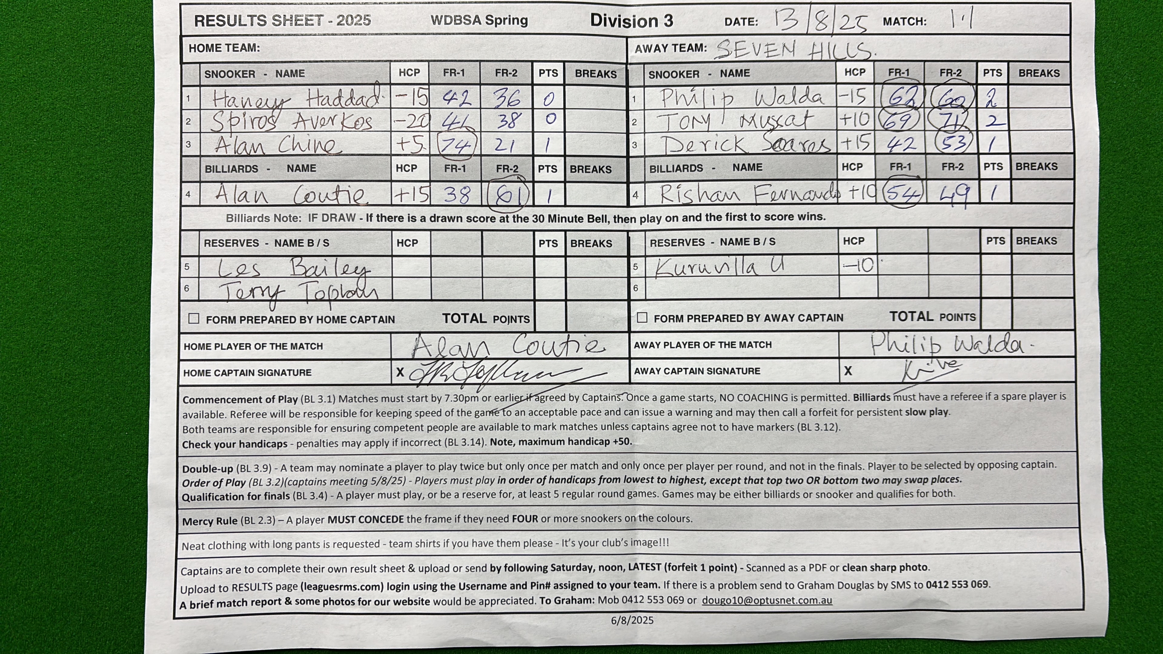 | Alan Couttie (15) | Rishan Fernando (10) | 2025-08-13 23:51:29 | Div3-Seven Hills |