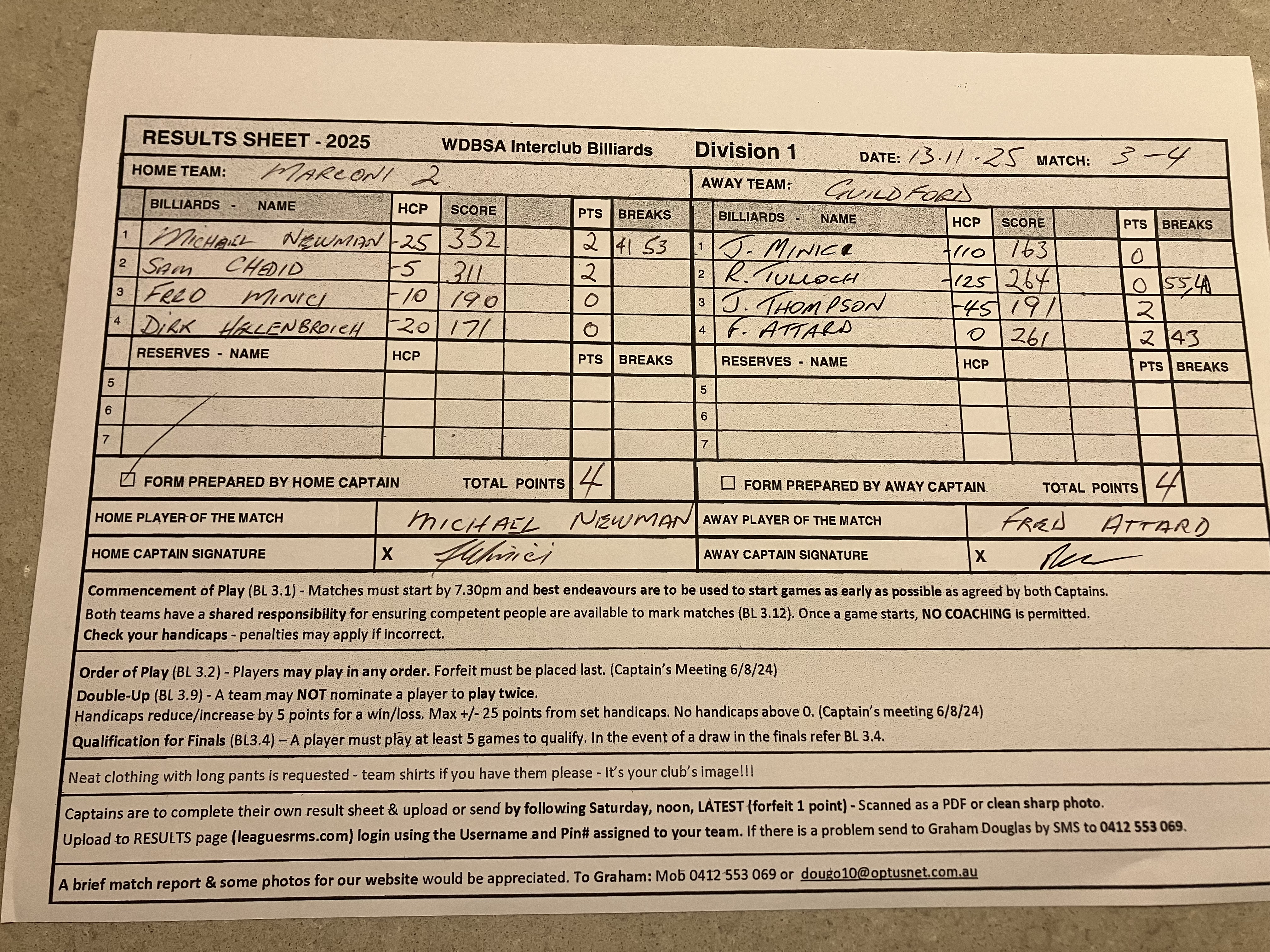 | POS | Marconi #2 | Score | Net | PTS | Break | Guildford | Score | Net | PTS | Breaks | Result Note | Updated on | Update by |