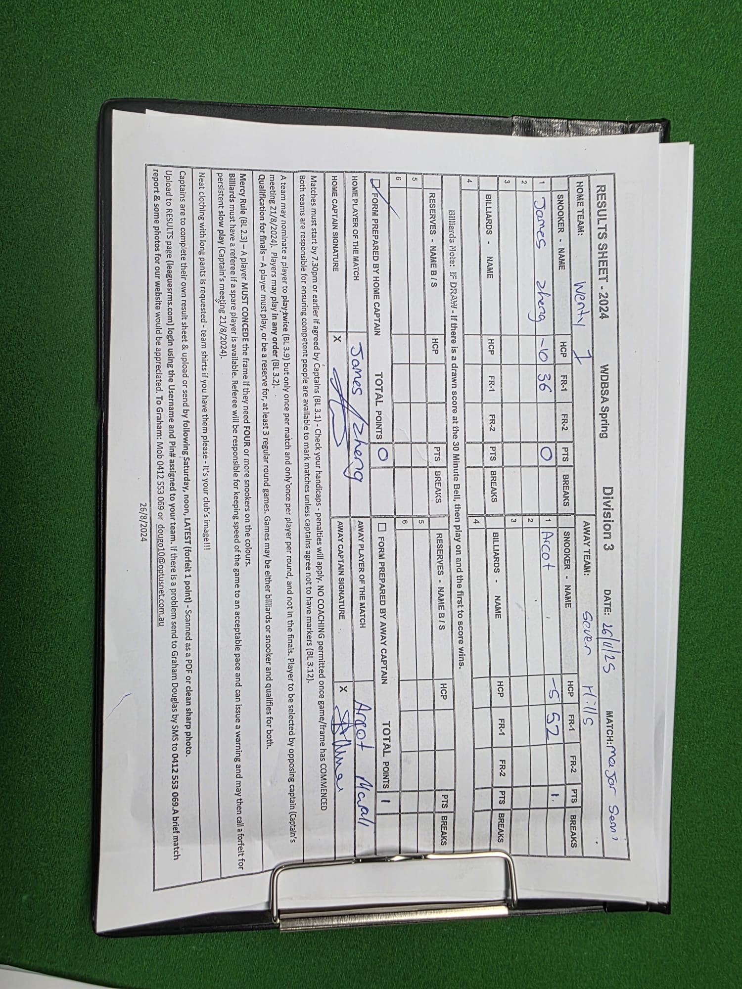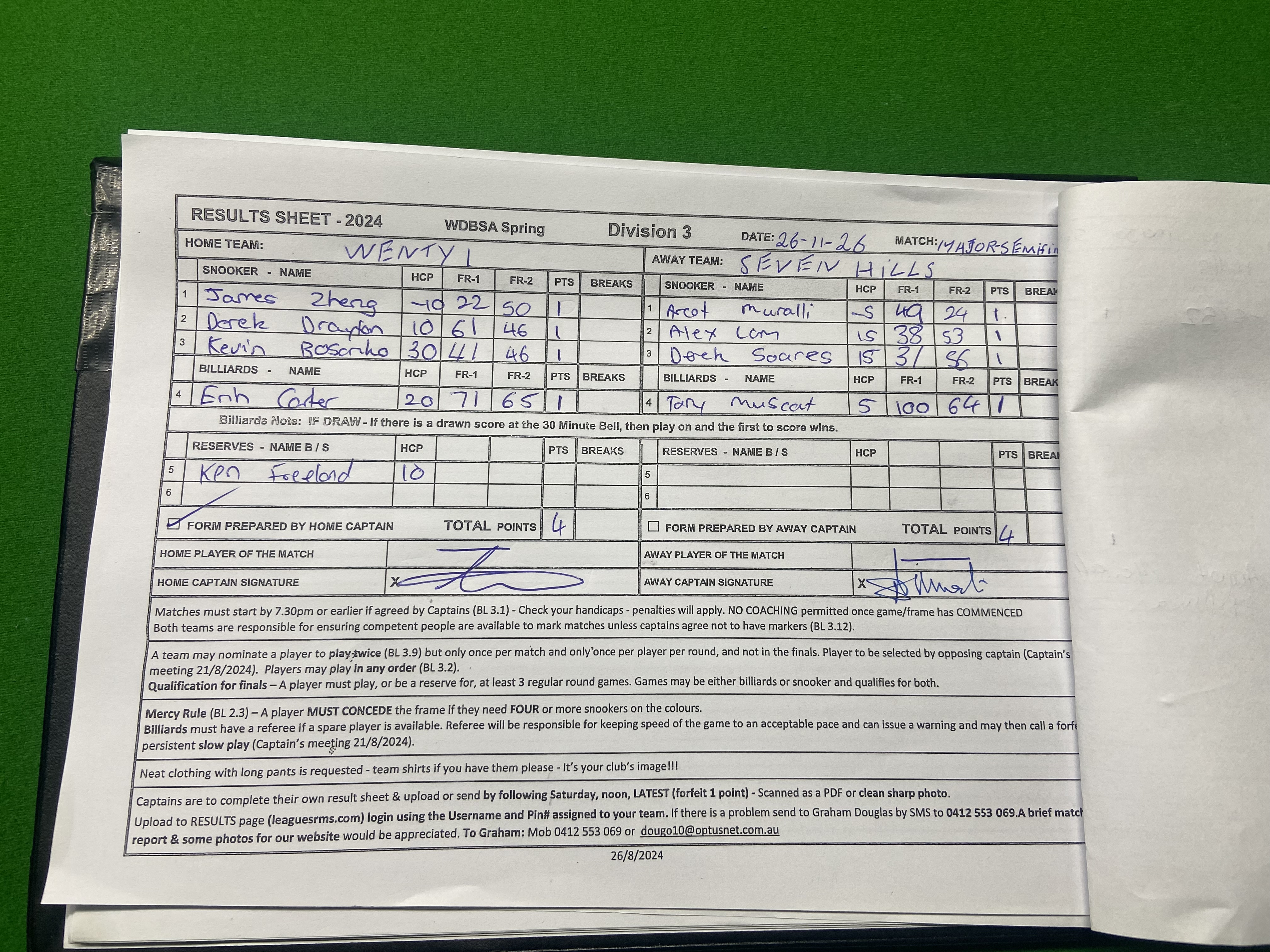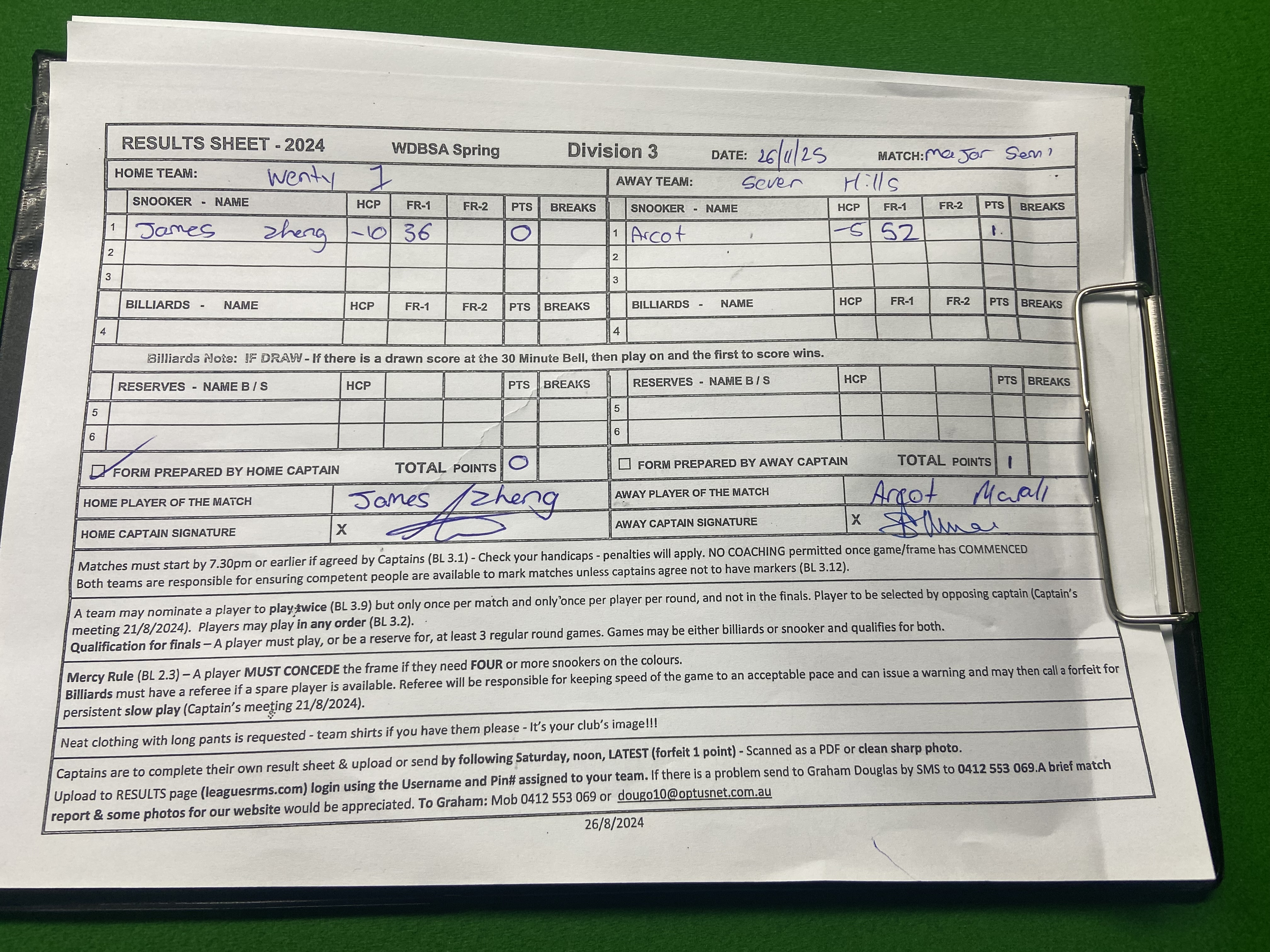 | POS | Wenty #1 | Frame 1 | Net | Frame 2 | Net | PTS | Breaks | Seven Hills | Frame 1 | Net | Frame 2 | Net | PTS | Breaks | Result Note | Updated on | Update by |