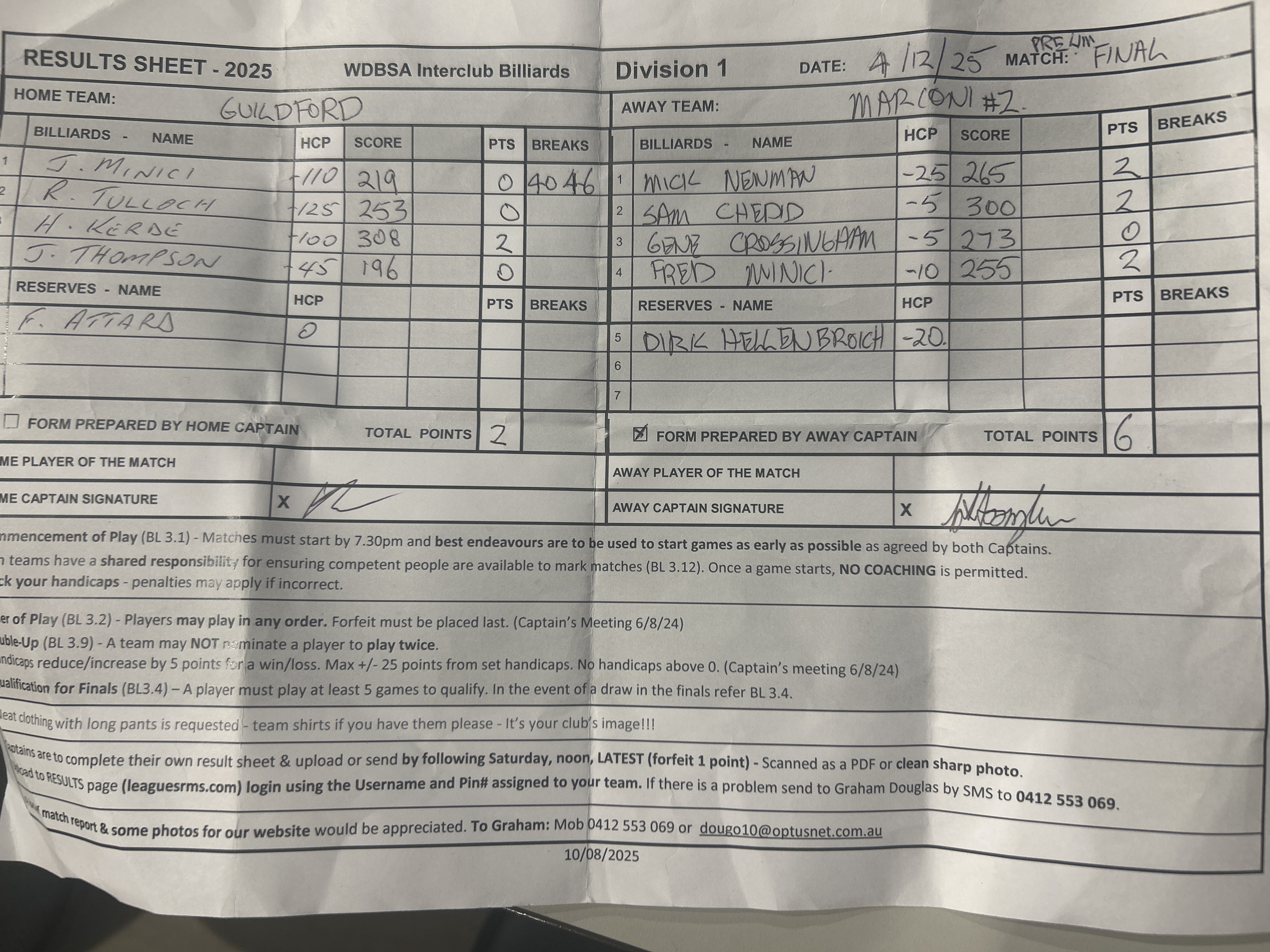 | POS | Guildford | Score | Net | PTS | Break | Marconi #2 | Score | Net | PTS | Breaks | Result Note | Updated on | Update by |