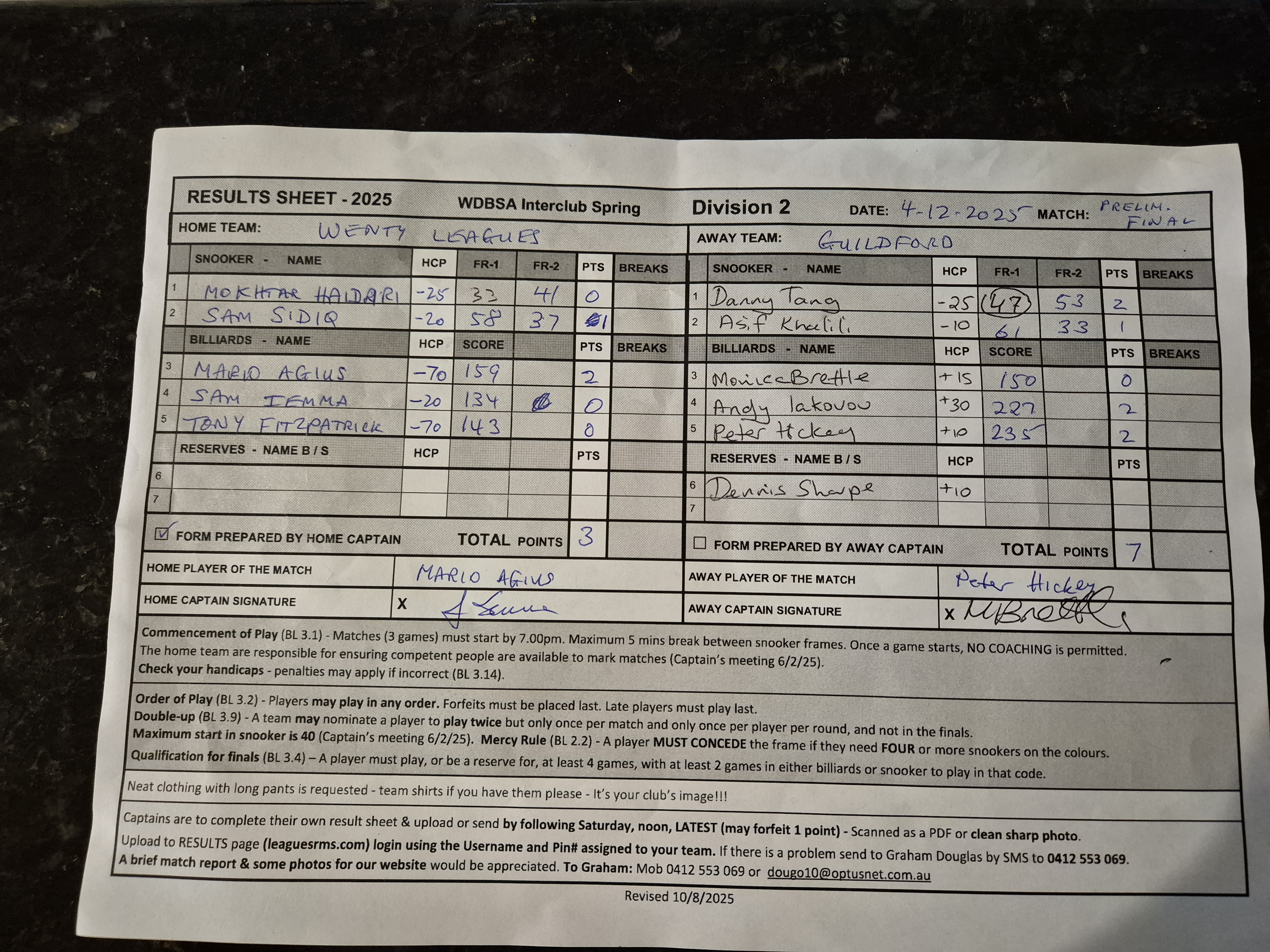 | POS | Wenty | Frame 1 | Net | Frame 2 | Net | PTS | Breaks | Guildford | Frame 1 | Net | Frame 2 | Net | PTS | Breaks | Result Note | Updated on | Update by |