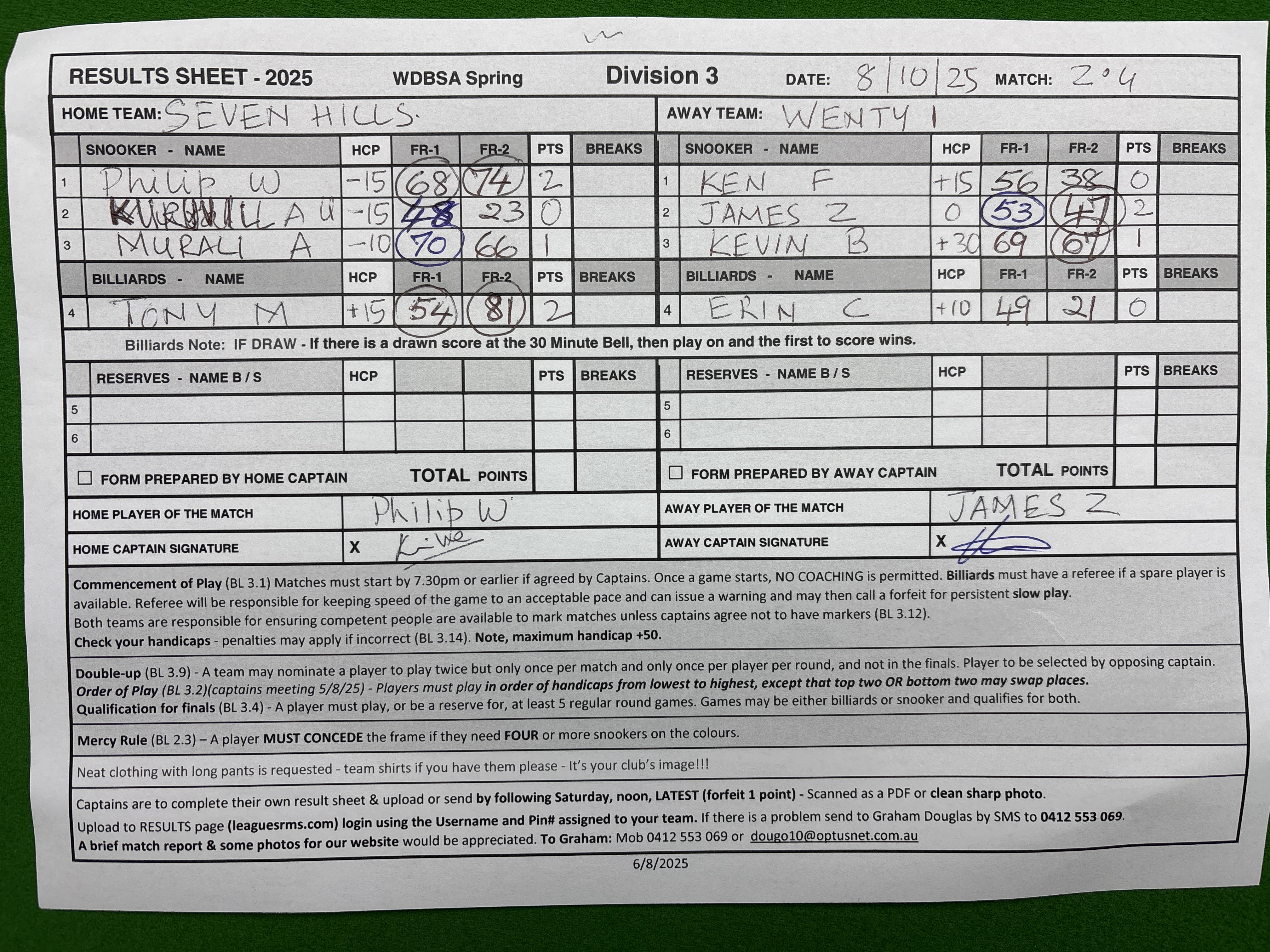 | POS | Seven Hills | Frame 1 | Net | Frame 2 | Net | PTS | Breaks | Wenty #1 | Frame 1 | Net | Frame 2 | Net | PTS | Breaks | Result Note | Updated on | Update by |