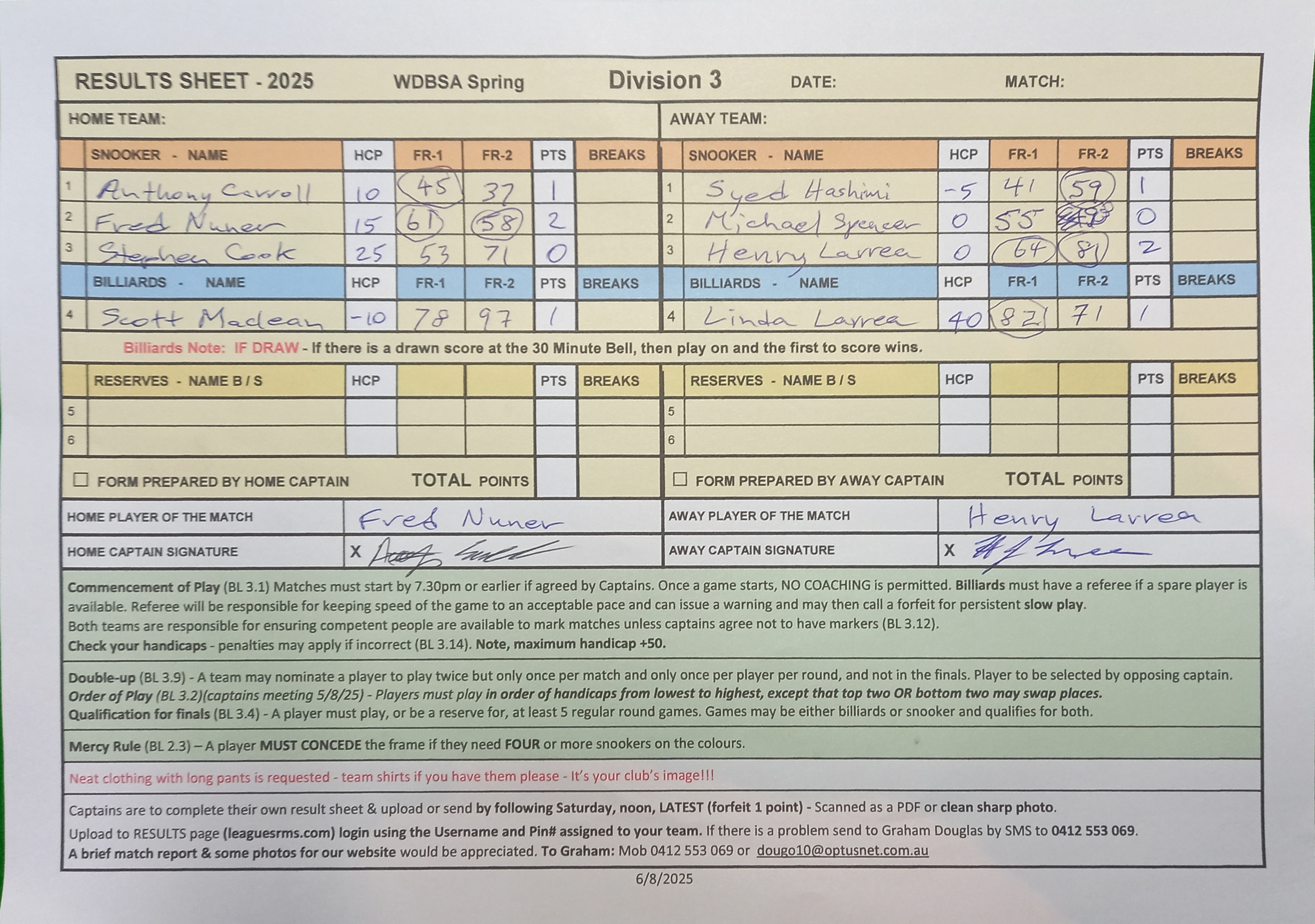 | Fred Nuner (15) | Michael Spencer (0) | 2025-10-08 21:44:41 | Div3-Guildford #2 | ||||||||||||||