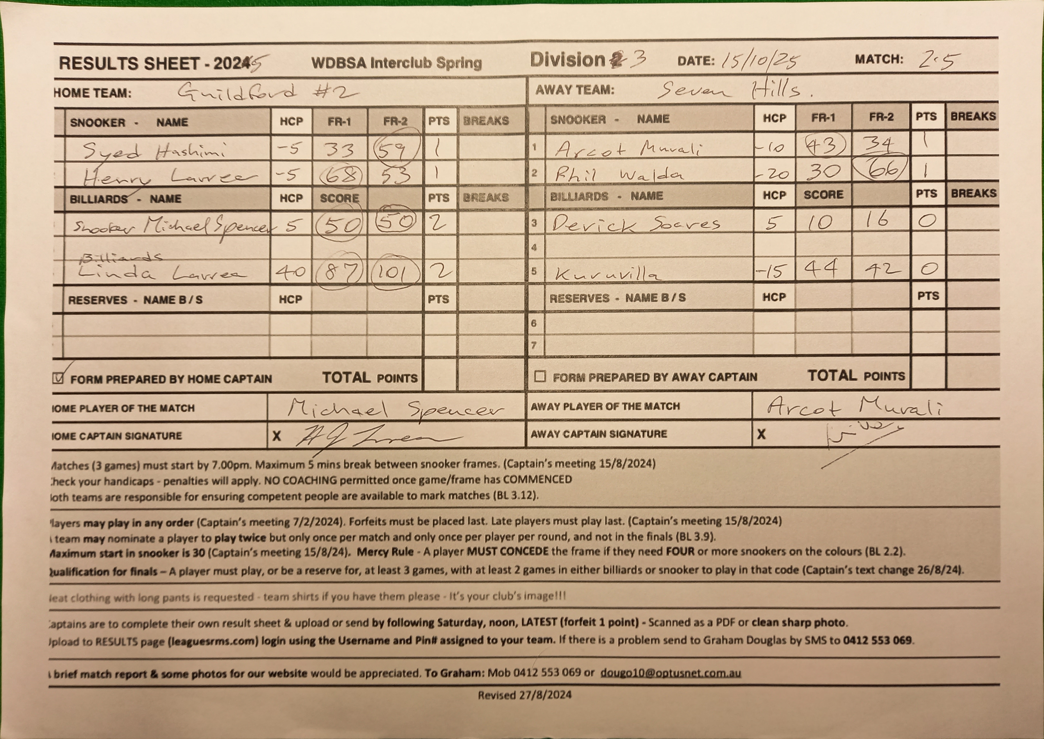 | POS | Guildford #2 | Frame 1 | Net | Frame 2 | Net | PTS | Breaks | Seven Hills | Frame 1 | Net | Frame 2 | Net | PTS | Breaks | Result Note | Updated on | Update by |