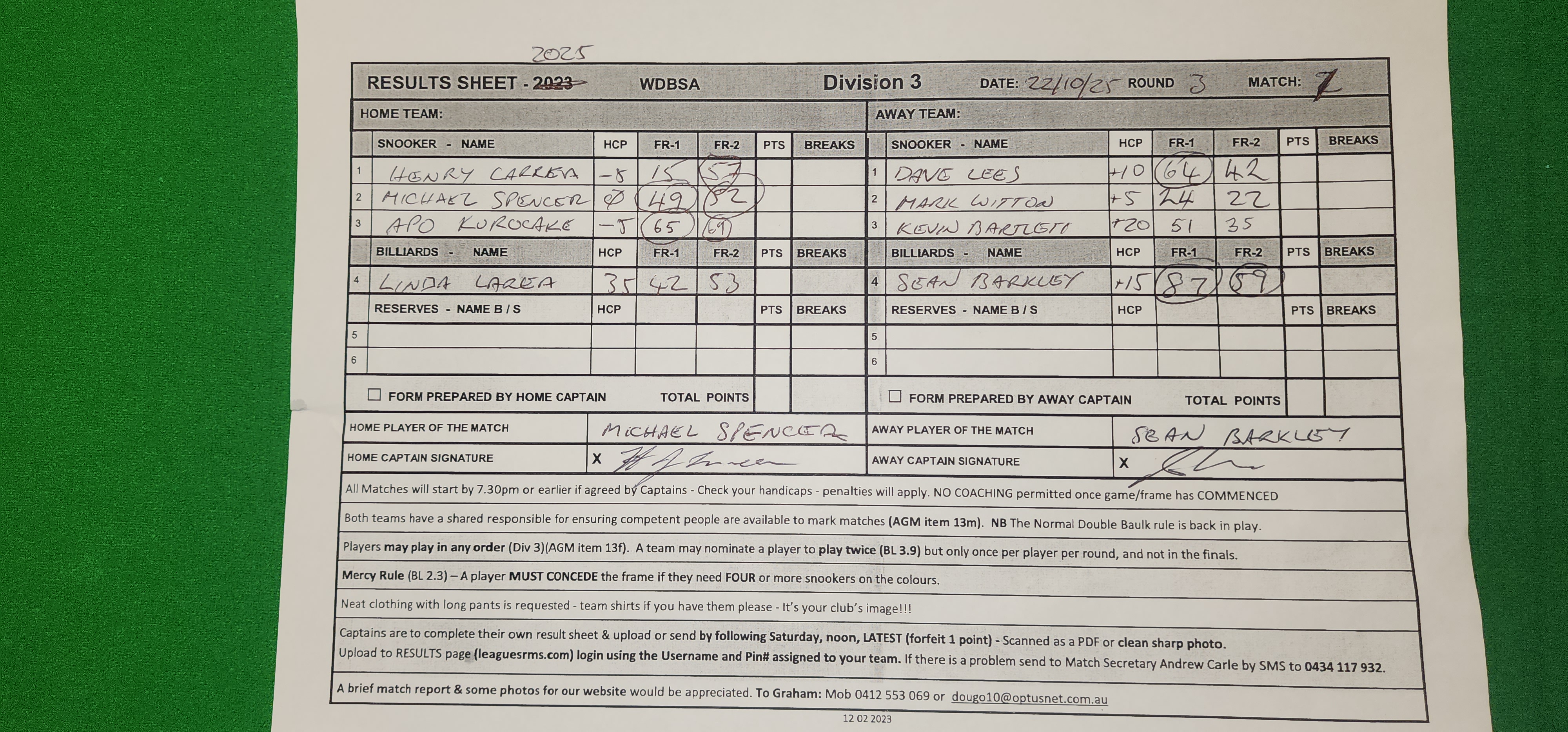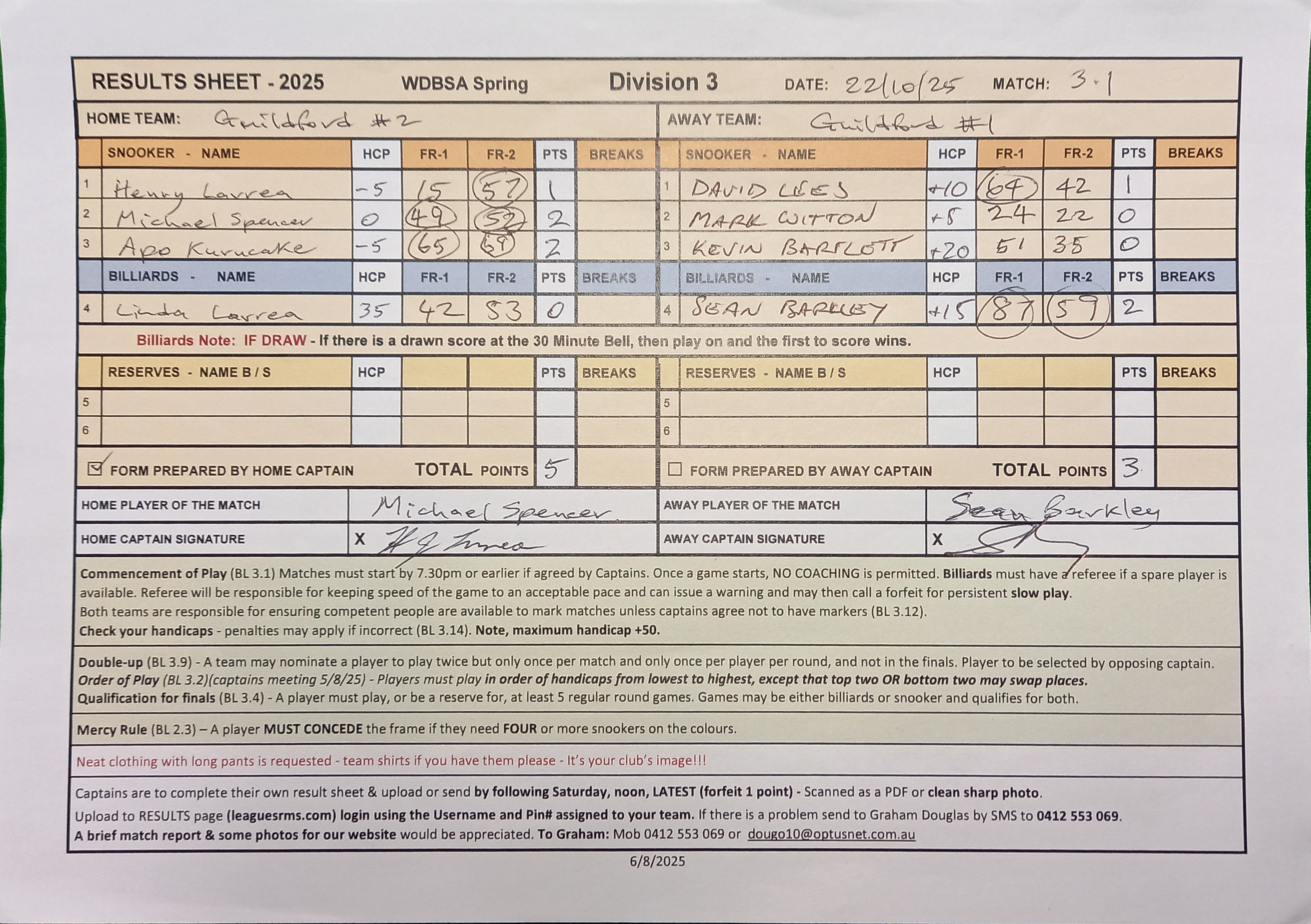 | Michael Spencer (0) | Mark Whitton (5) | 2025-10-22 23:26:21 | Div3-Guildford #2 | ||||||||||||||