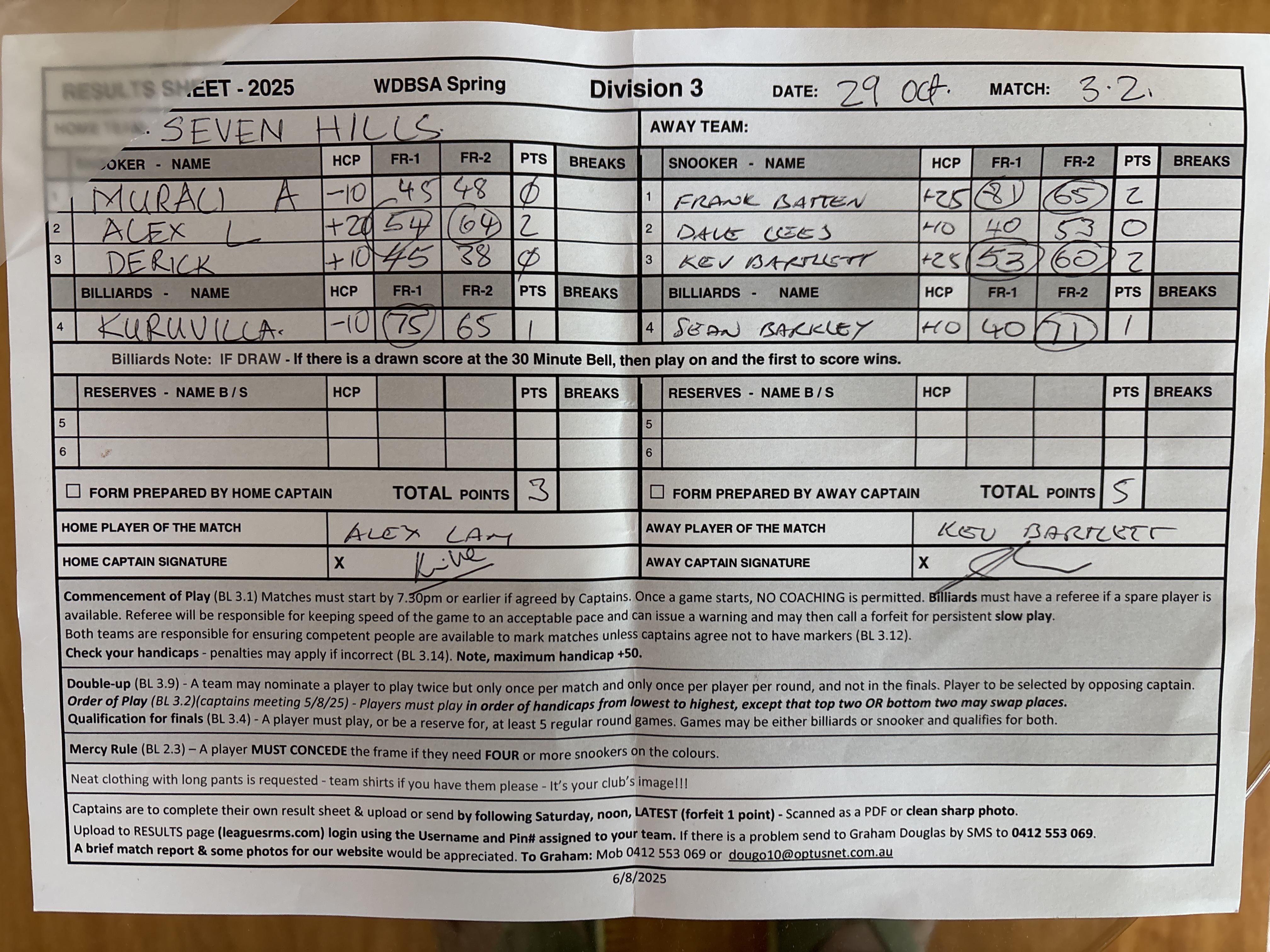 | POS | Seven Hills | Frame 1 | Net | Frame 2 | Net | PTS | Breaks | Guildford #1 | Frame 1 | Net | Frame 2 | Net | PTS | Breaks | Result Note | Updated on | Update by |