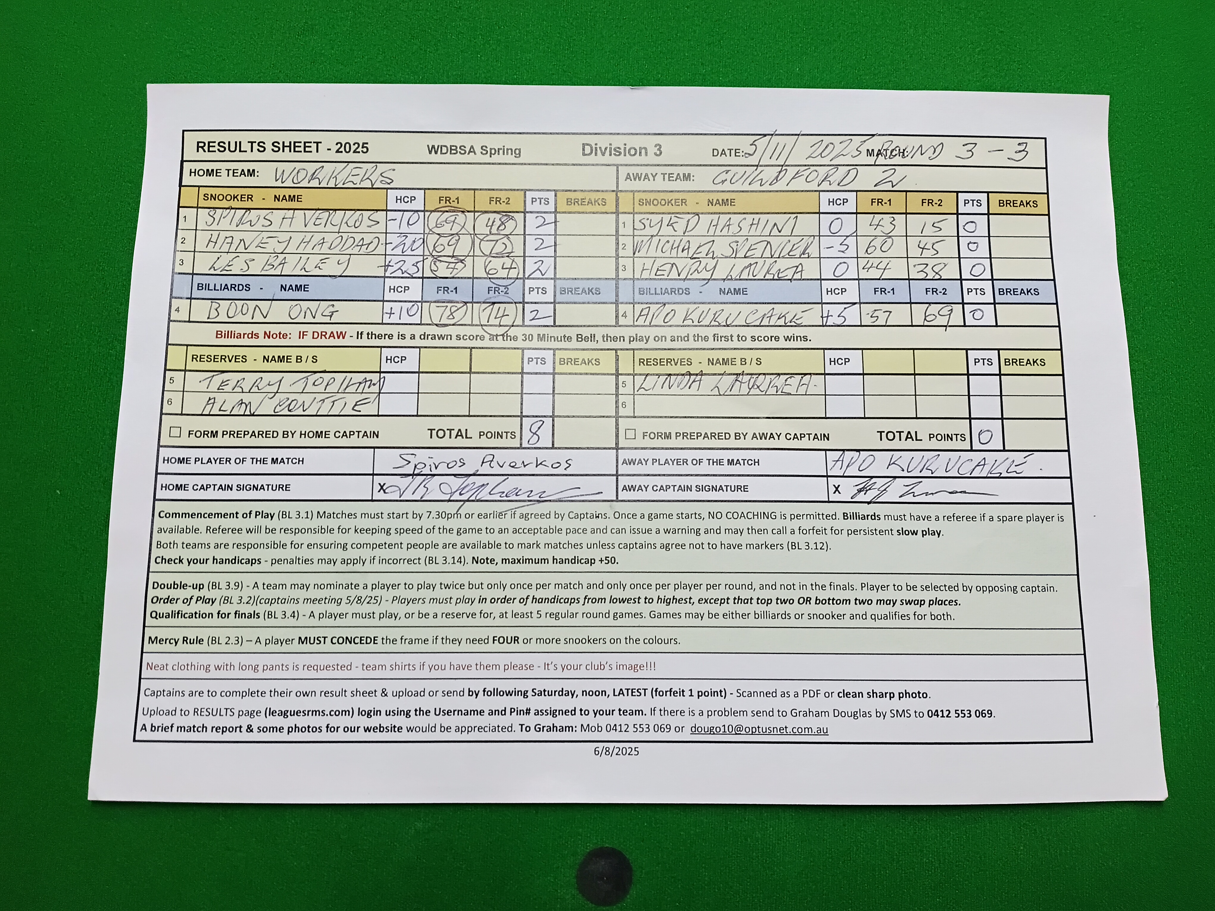 | POS | Workers | Frame 1 | Net | Frame 2 | Net | PTS | Breaks | Guildford #2 | Frame 1 | Net | Frame 2 | Net | PTS | Breaks | Result Note | Updated on | Update by |
