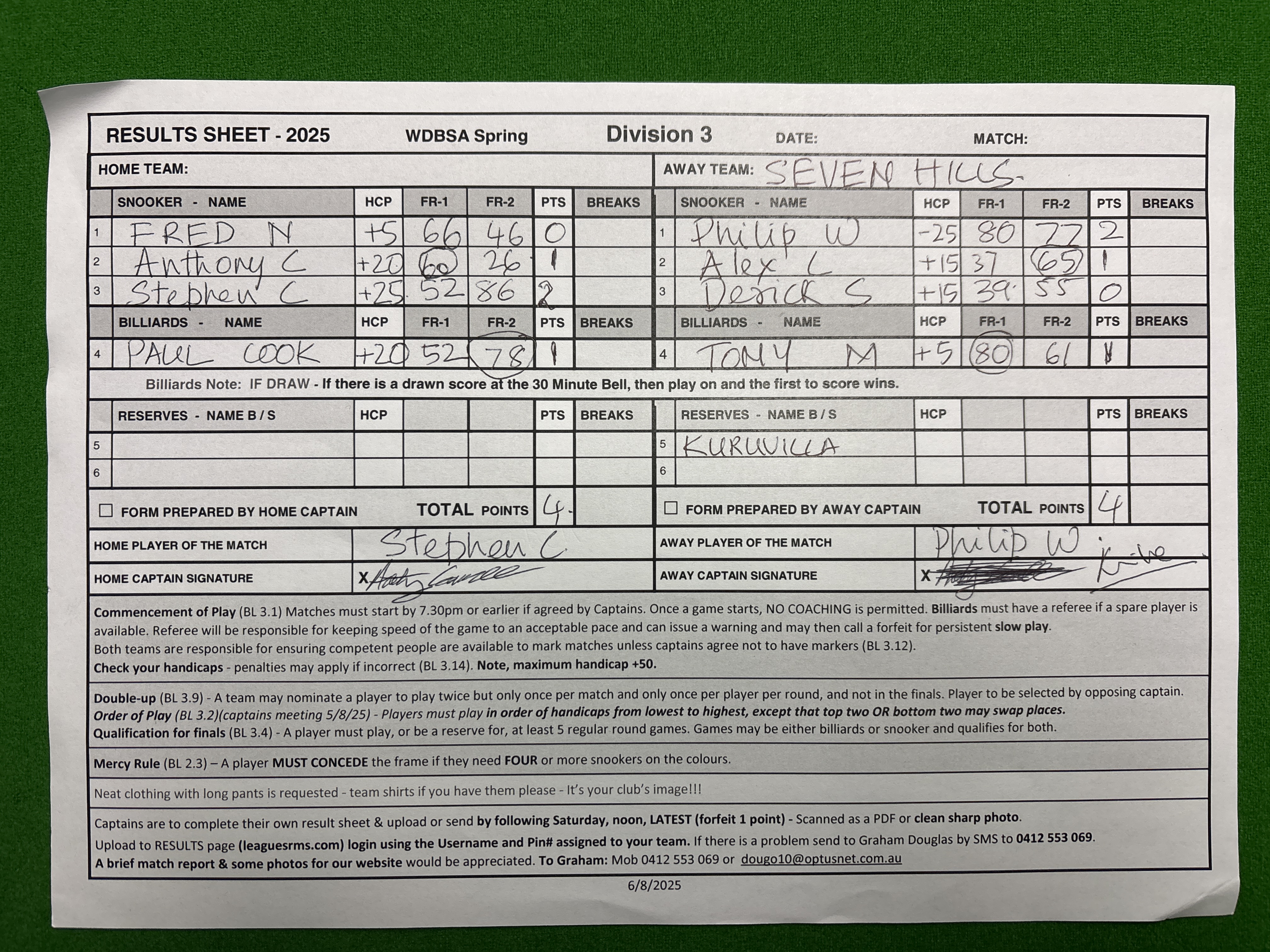| 4 | Paul Cook (20) | 52 | 37 | 78 | 63 | 1 | | Tony Muscat (5) | 80 | 80 | 61 | 61 | 1 | | | 2025-11-05 20:52:58 | Div3-Wenty 2 |