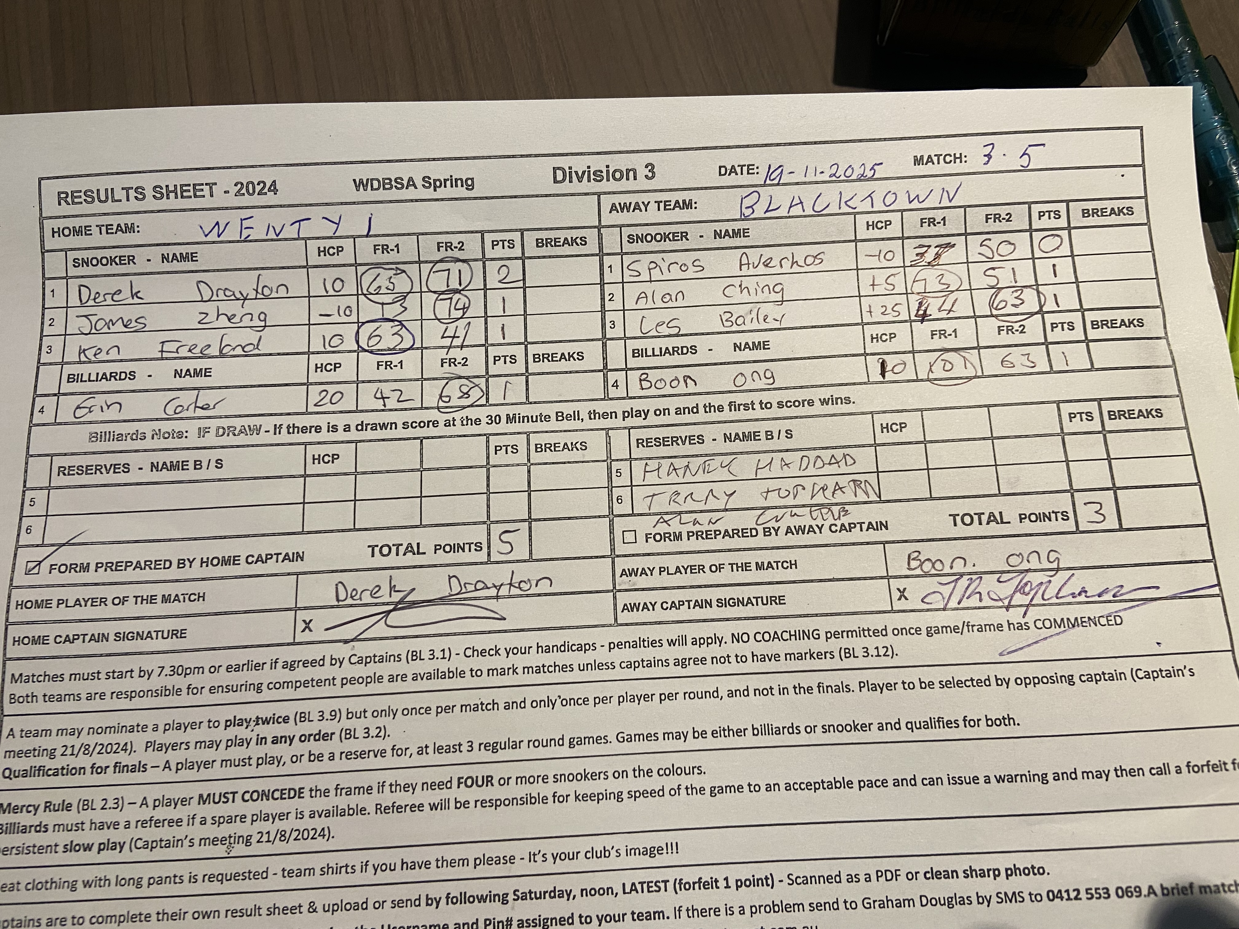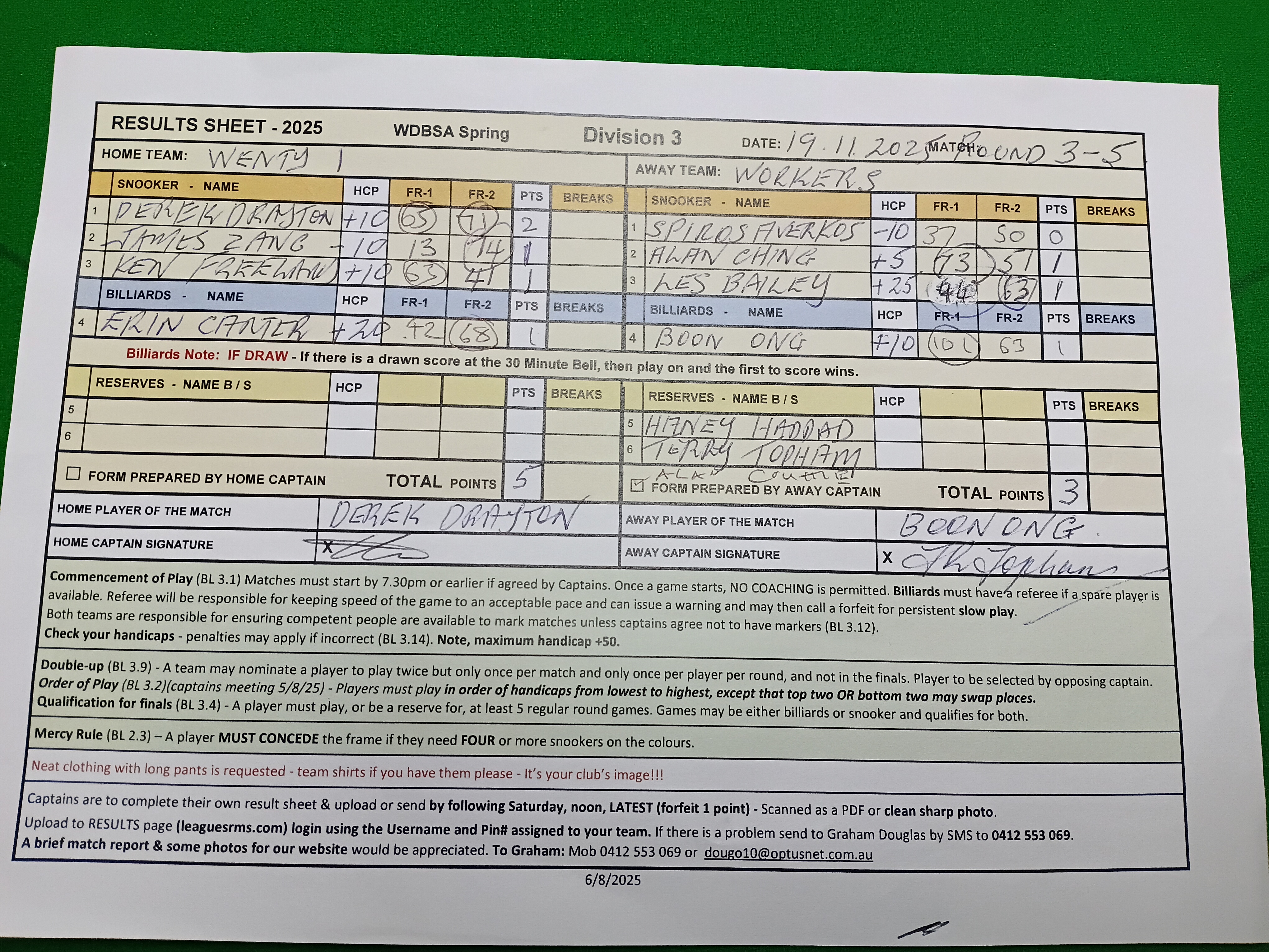 | Erin Carter (20) | Boon Ong (10) | 2025-11-19 21:32:36 | Div3-Wenty 1 |