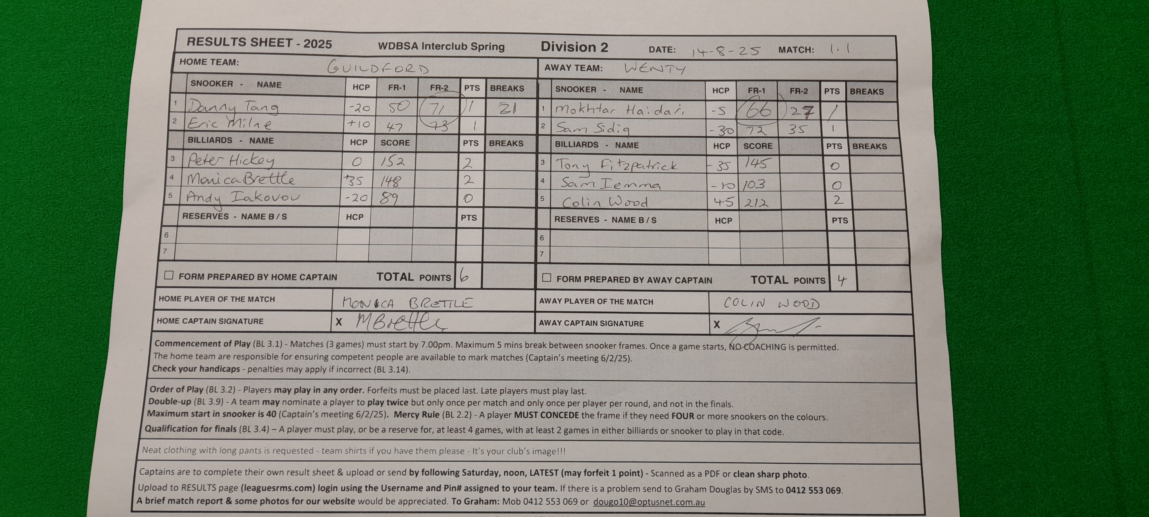 | POS | Guildford | Frame 1 | Net | Frame 2 | Net | PTS | Breaks | Wenty | Frame 1 | Net | Frame 2 | Net | PTS | Breaks | Result Note | Updated on | Update by |