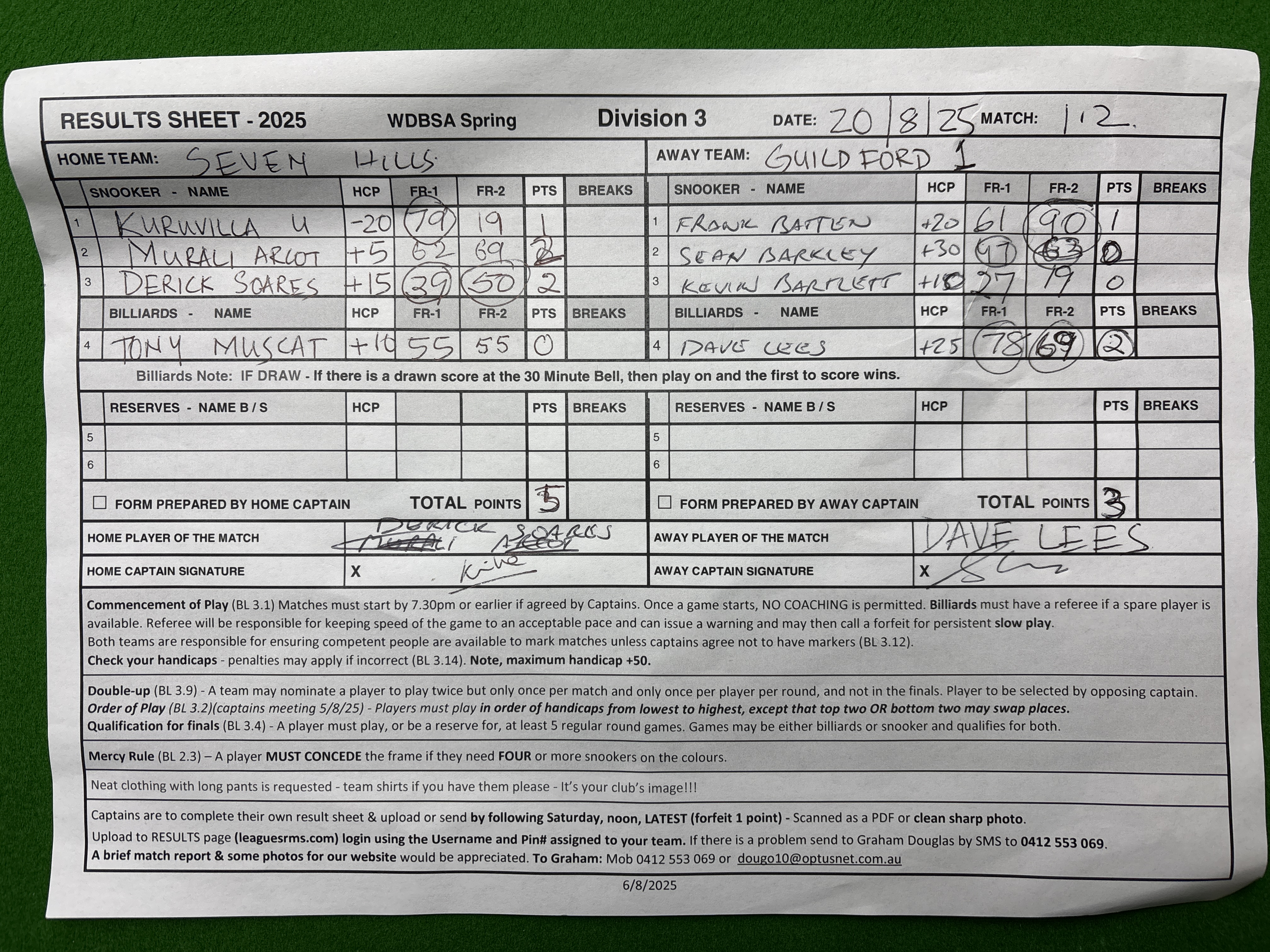 | POS | Seven Hills | Frame 1 | Net | Frame 2 | Net | PTS | Breaks | Guildford #1 | Frame 1 | Net | Frame 2 | Net | PTS | Breaks | Result Note | Updated on | Update by |