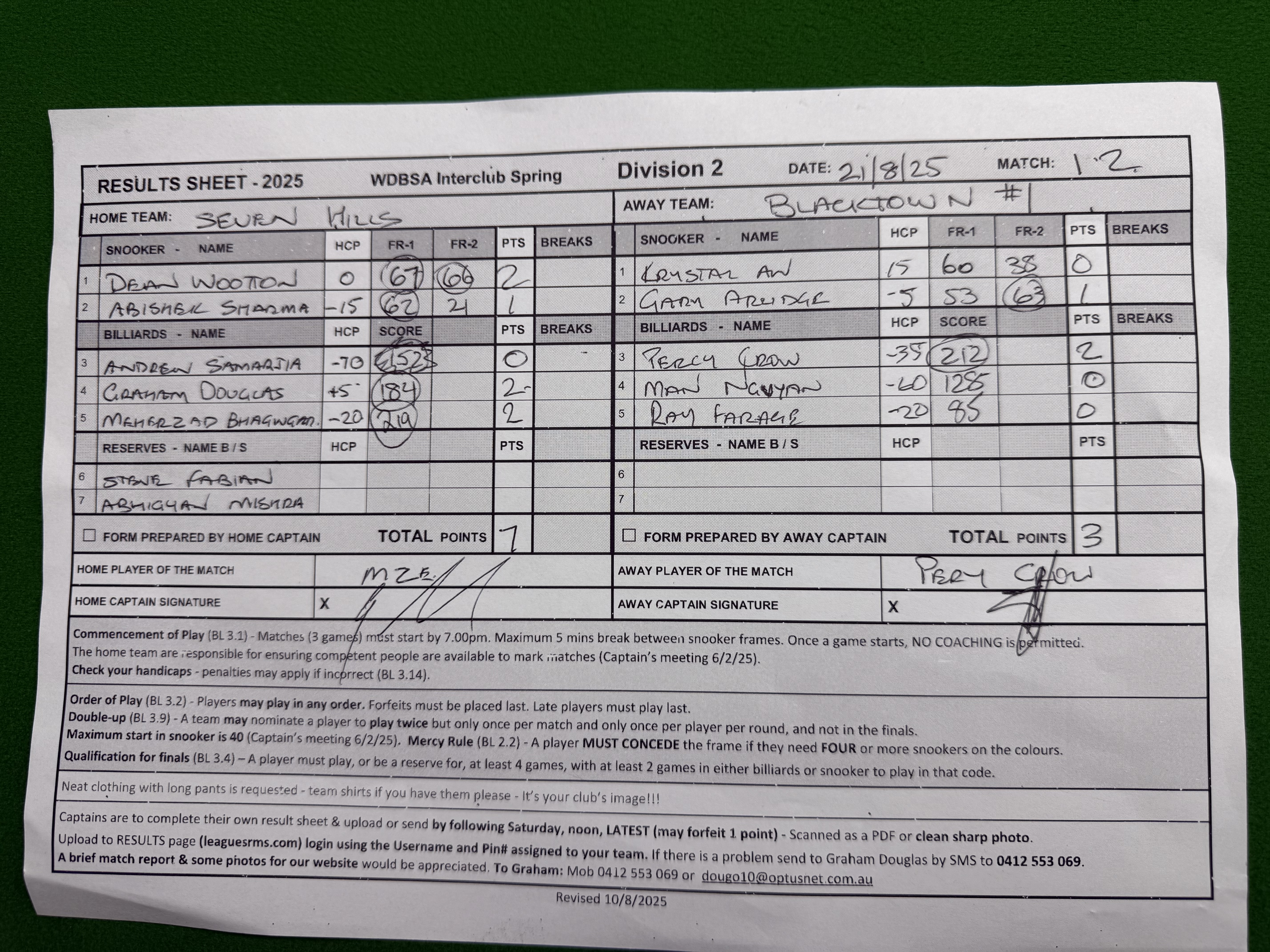 | POS | Seven Hills | Frame 1 | Net | Frame 2 | Net | PTS | Breaks | Workers #1 | Frame 1 | Net | Frame 2 | Net | PTS | Breaks | Result Note | Updated on | Update by |