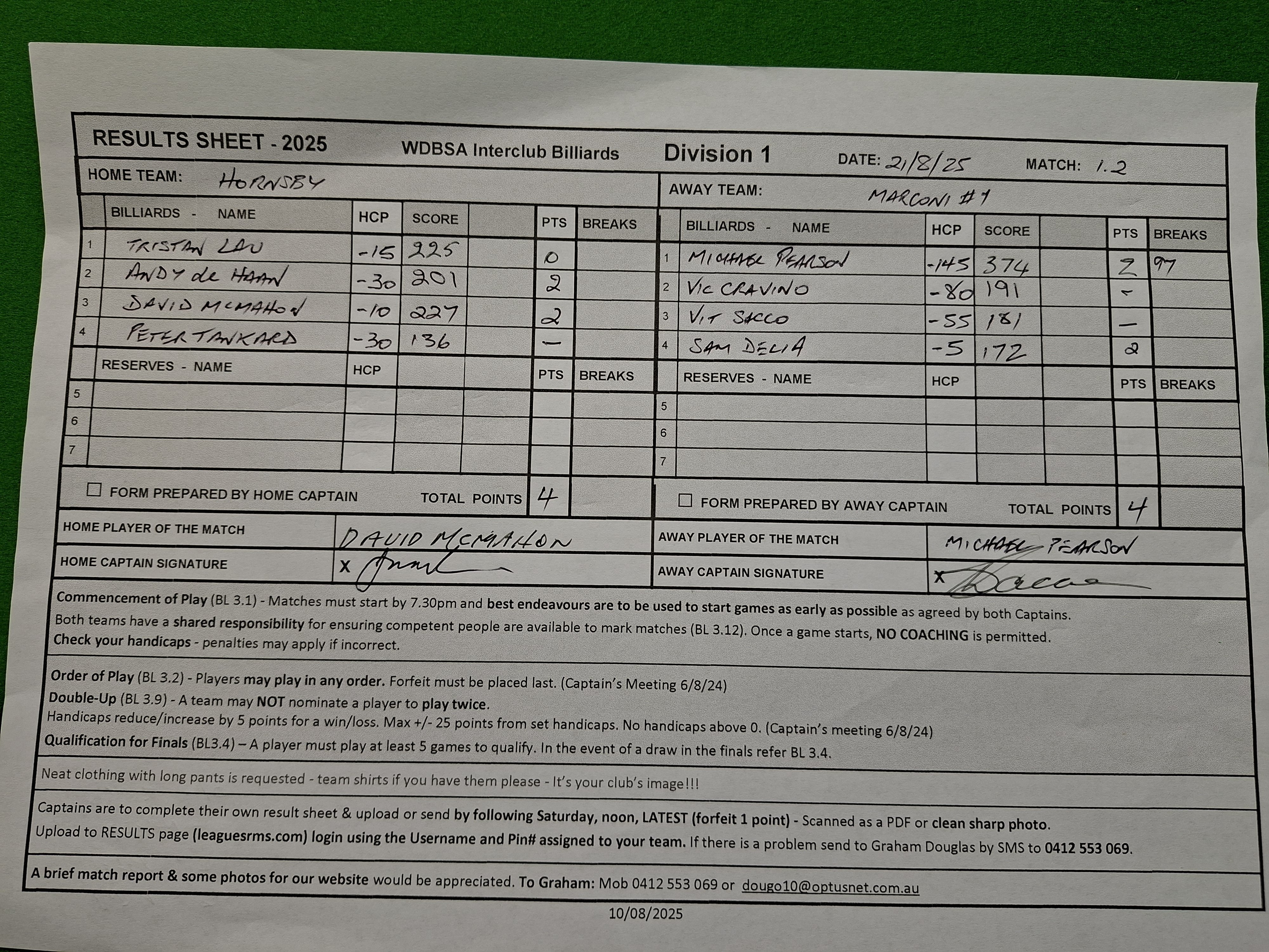 | POS | Hornsby | Score | Net | PTS | Break | Marconi #1 | Score | Net | PTS | Breaks | Result Note | Updated on | Update by |