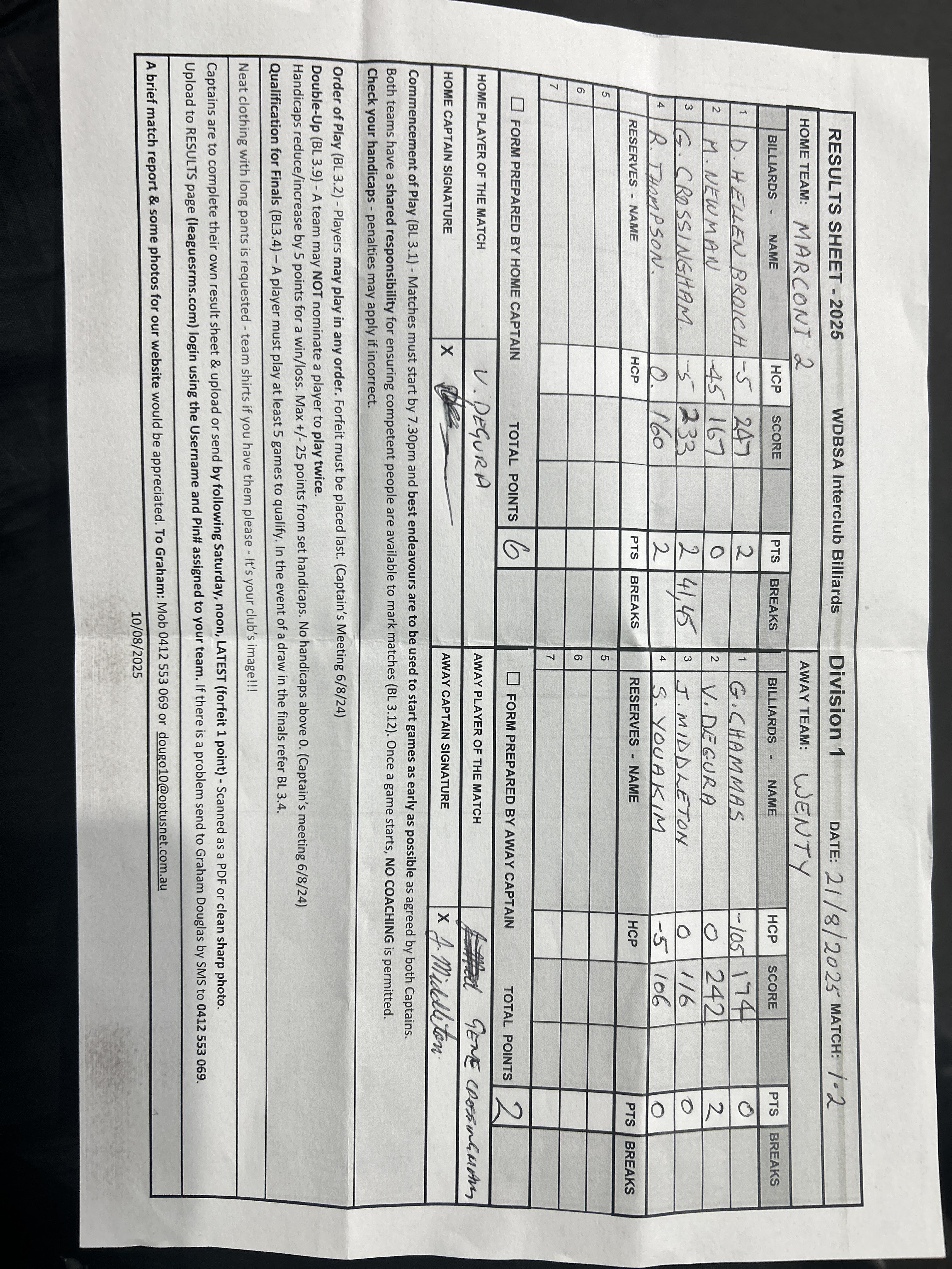 | Dirk Hellenbrioch (-5) | George Chammas (-105) | 2025-08-22 06:57:45 | Div1-Wenty | ||||||||||