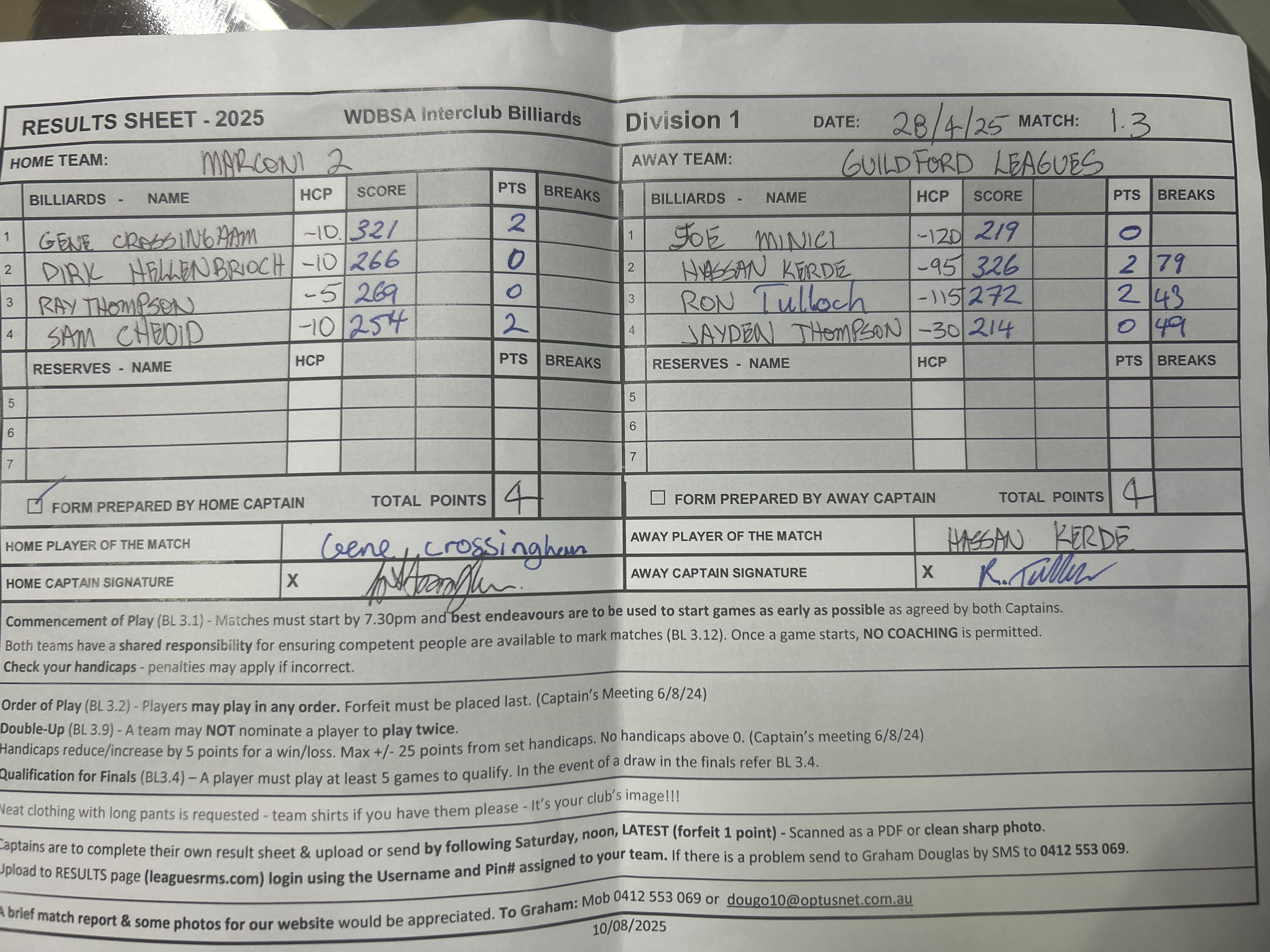 | POS | Marconi #2 | Score | Net | PTS | Break | Guildford | Score | Net | PTS | Breaks | Result Note | Updated on | Update by |
