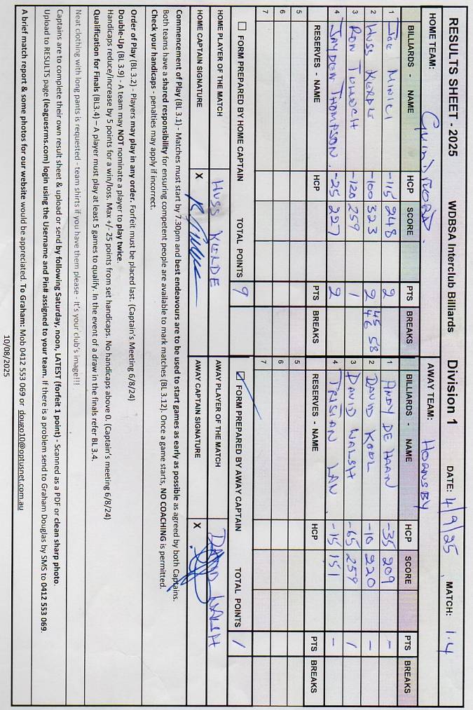 | Joe Minici (-115) | Andy De Haan (-35) | 2025-09-05 17:16:17 | Div1-Guildford | ||||||||||