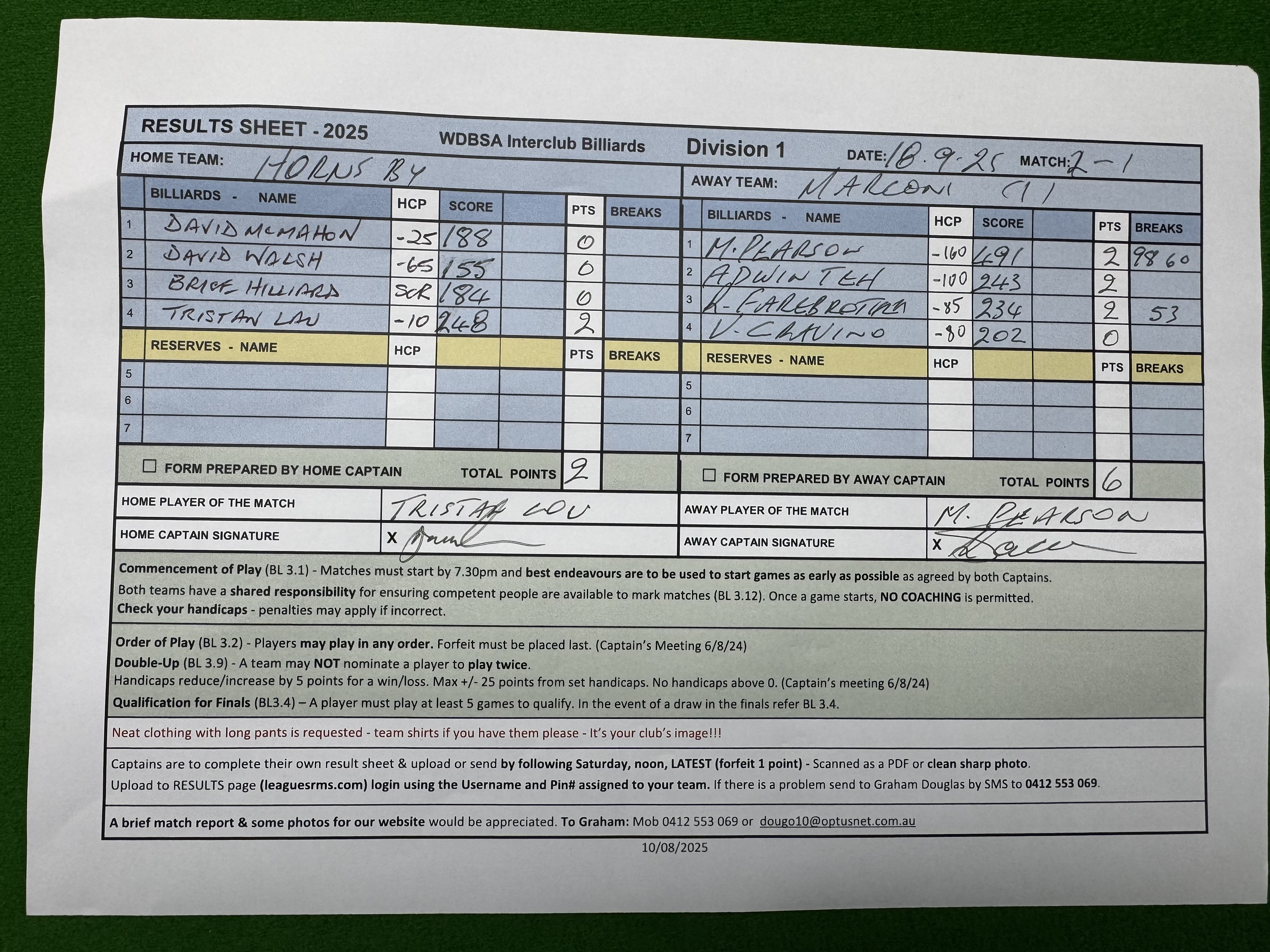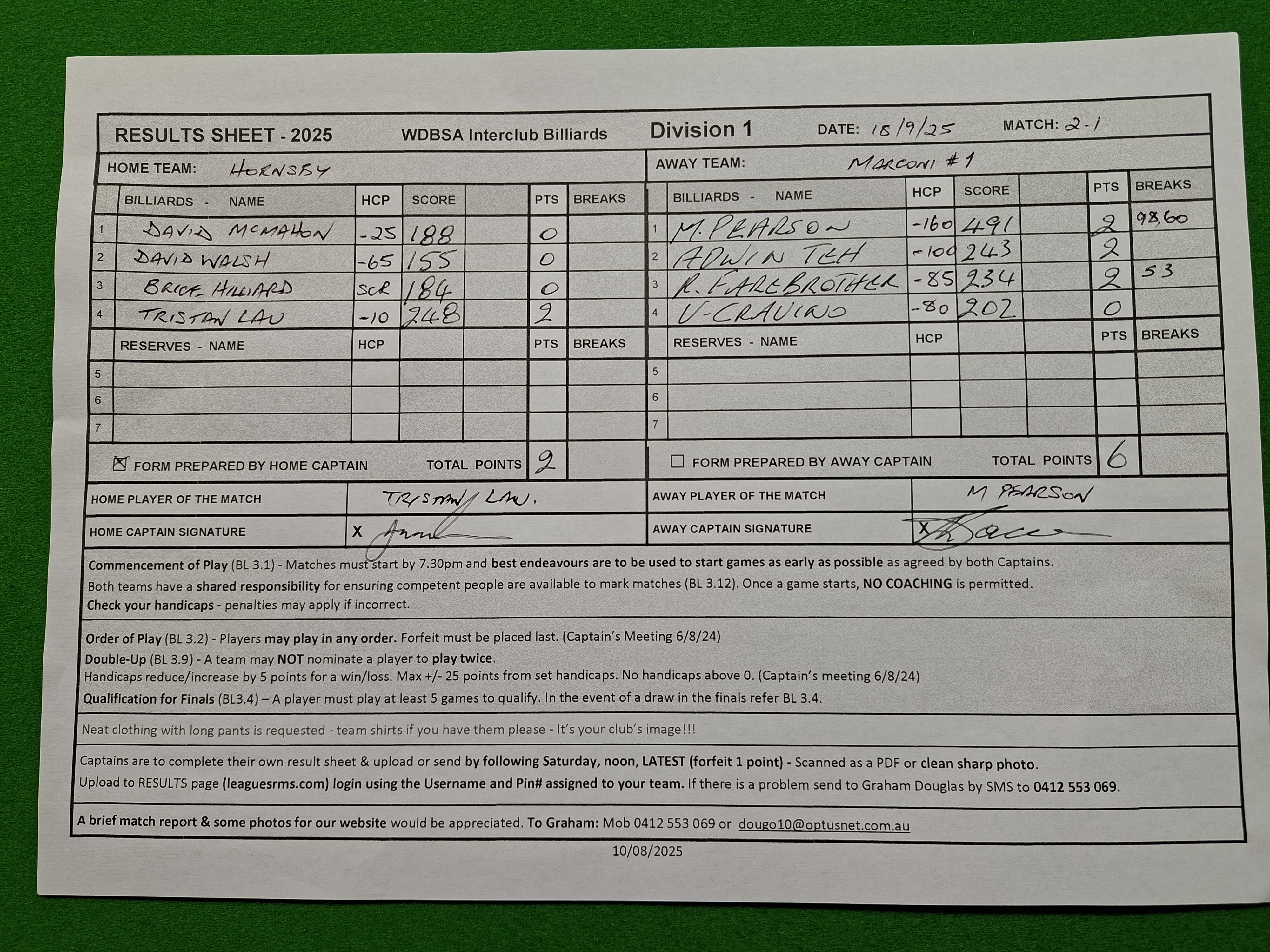 | David McMahon (-25) | Michael Pearson (-160) | 2025-09-19 15:51:53 | Div1-Hornsby | ||||||||||