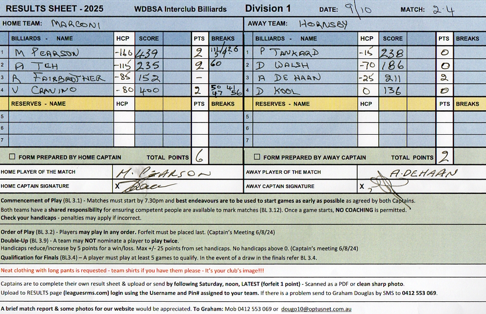 | POS | Marconi #1 | Score | Net | PTS | Break | Hornsby | Score | Net | PTS | Breaks | Result Note | Updated on | Update by |