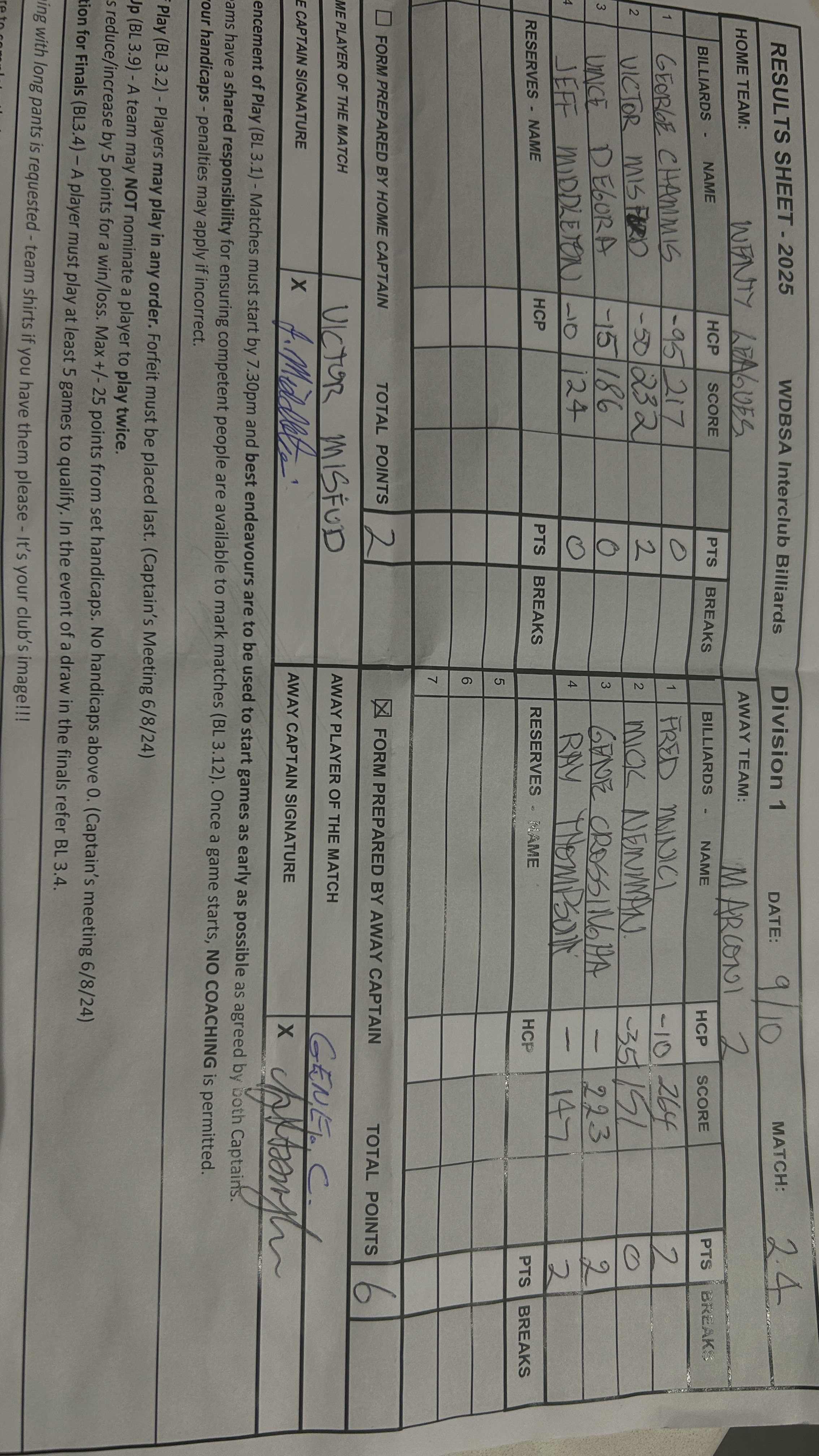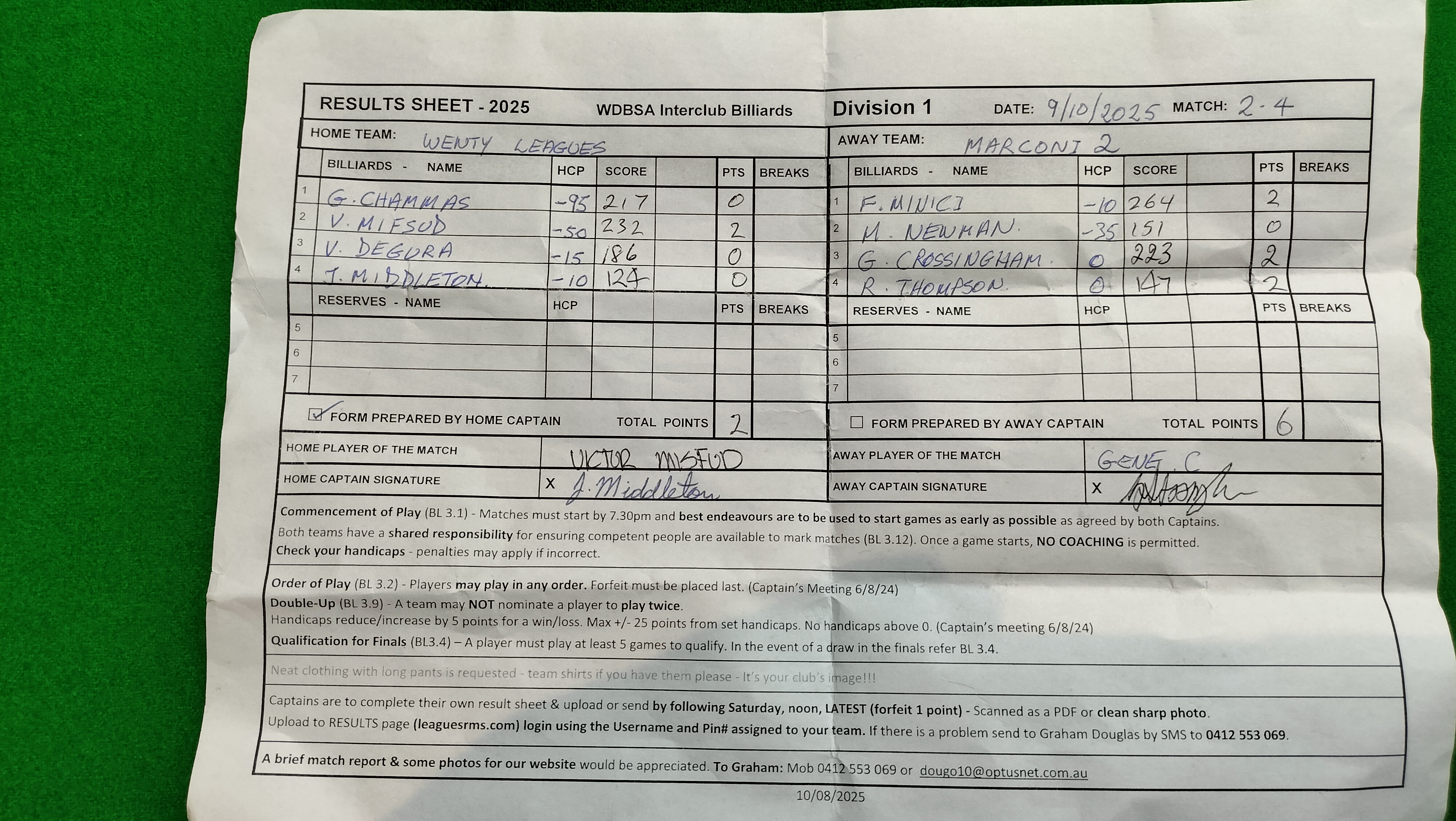| Vic Mifsud (-50) | Michael Newman (-35) | 2025-10-09 22:31:22 | Div1-Wenty | ||||||||||