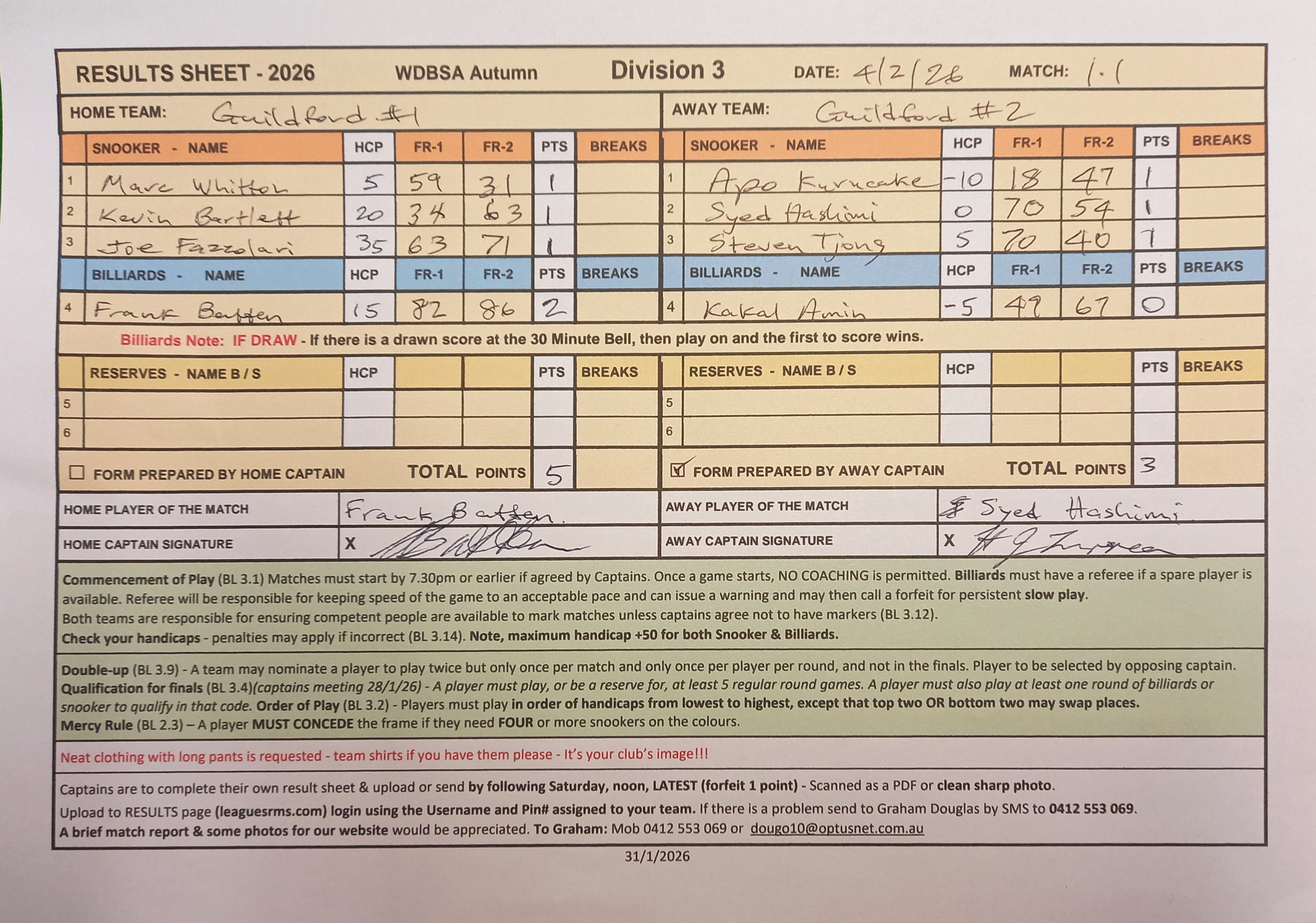 | Kevin Bartlett (20) | Syed Hashimi (0) | 2026-02-04 21:27:52 | Guildford #1 | ||||||||||||||
