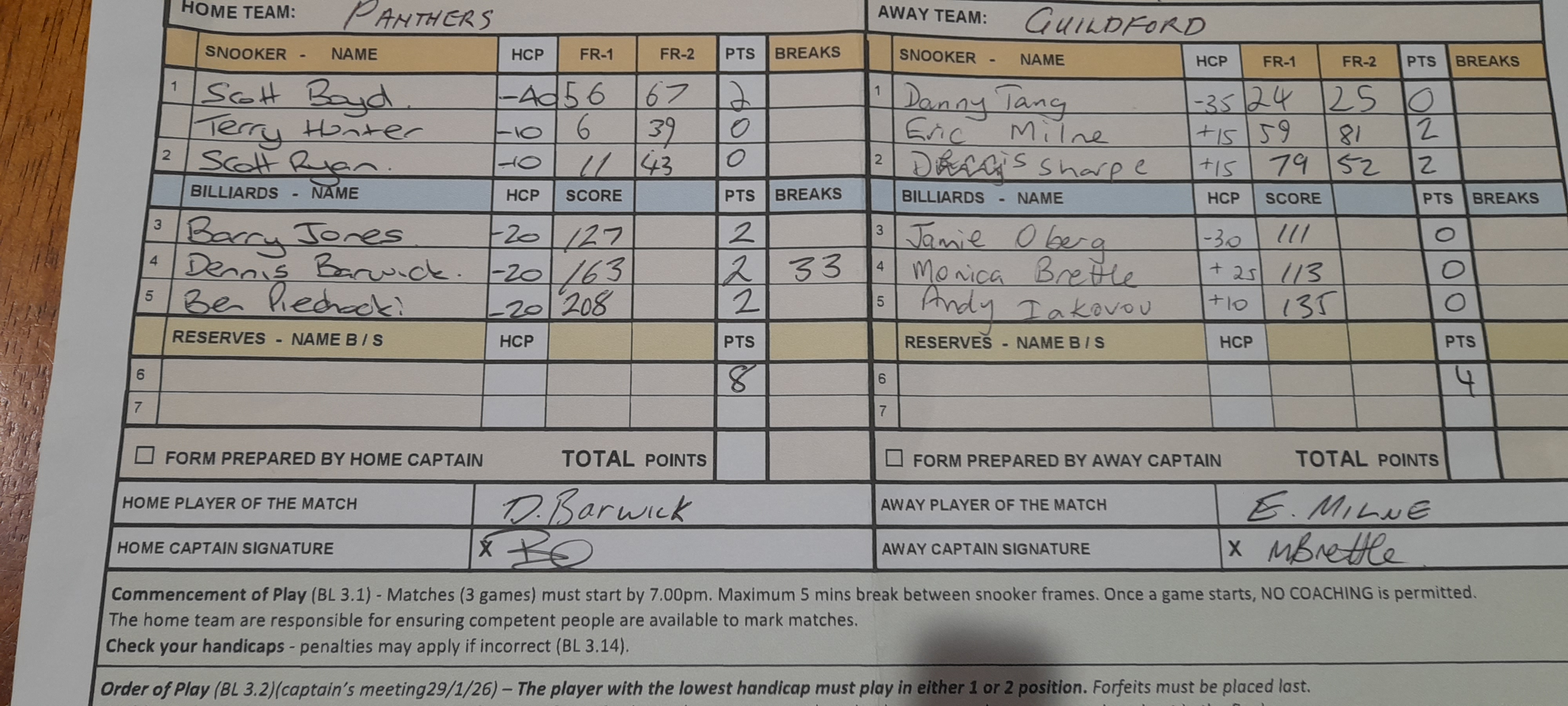 | POS | Panthers | Score | Net | PTS | Break | Guildford | Score | Net | PTS | Breaks | Result Note | Updated on | Update by |