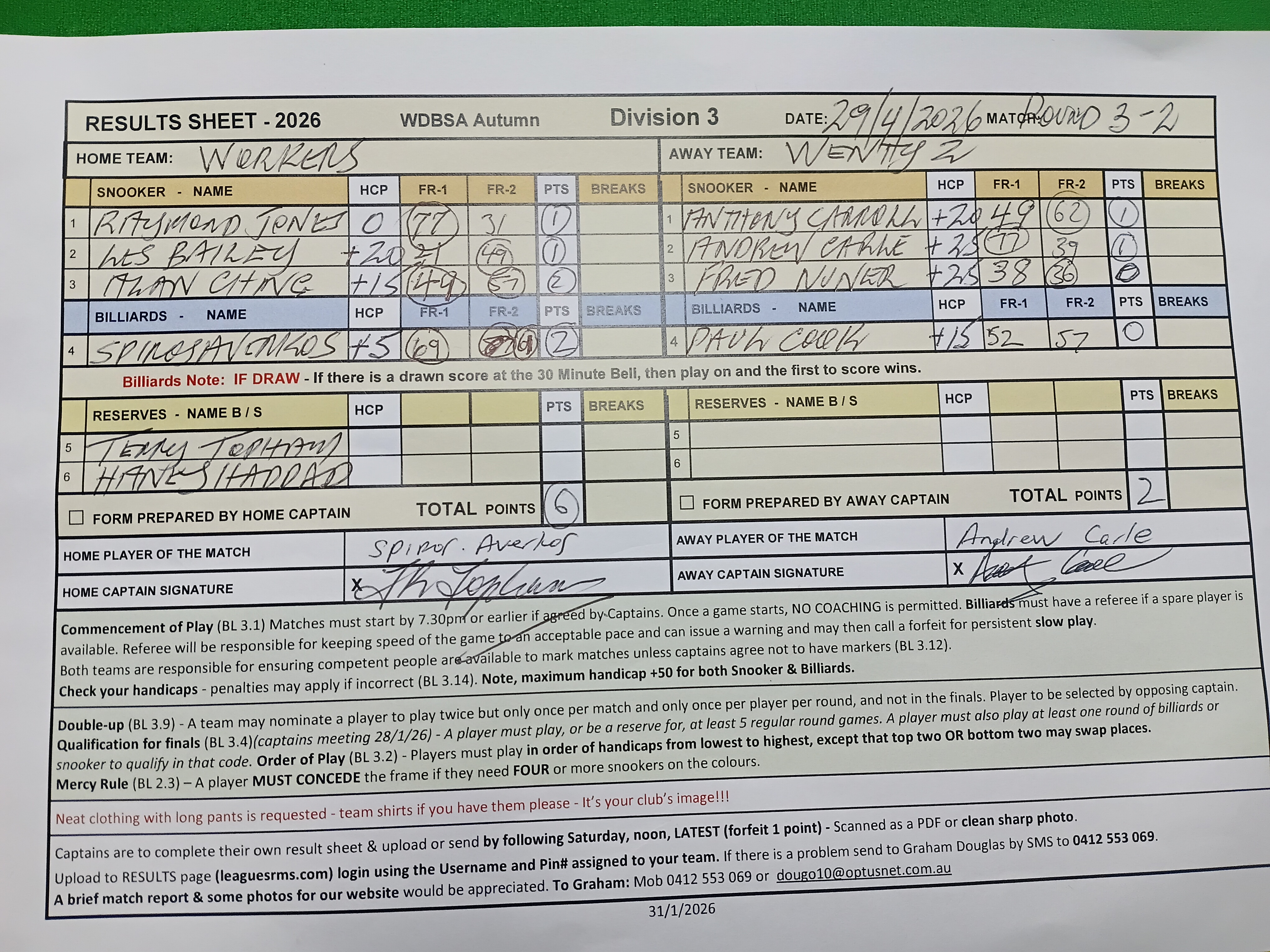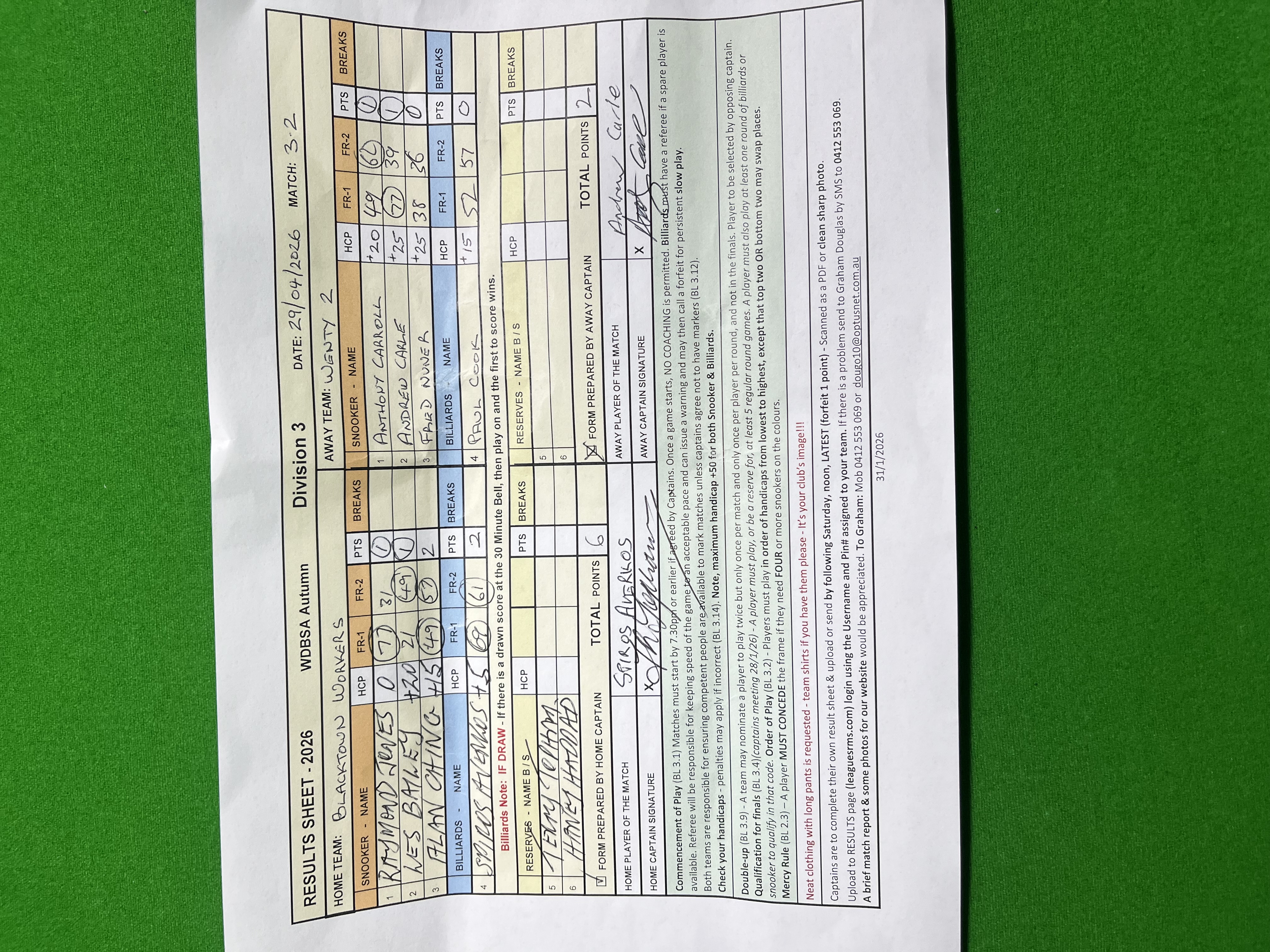 | POS | Workers | Frame 1 | Net | Frame 2 | Net | PTS | Breaks | Wenty #2 | Frame 1 | Net | Frame 2 | Net | PTS | Breaks | Result Note | Updated on | Update by |