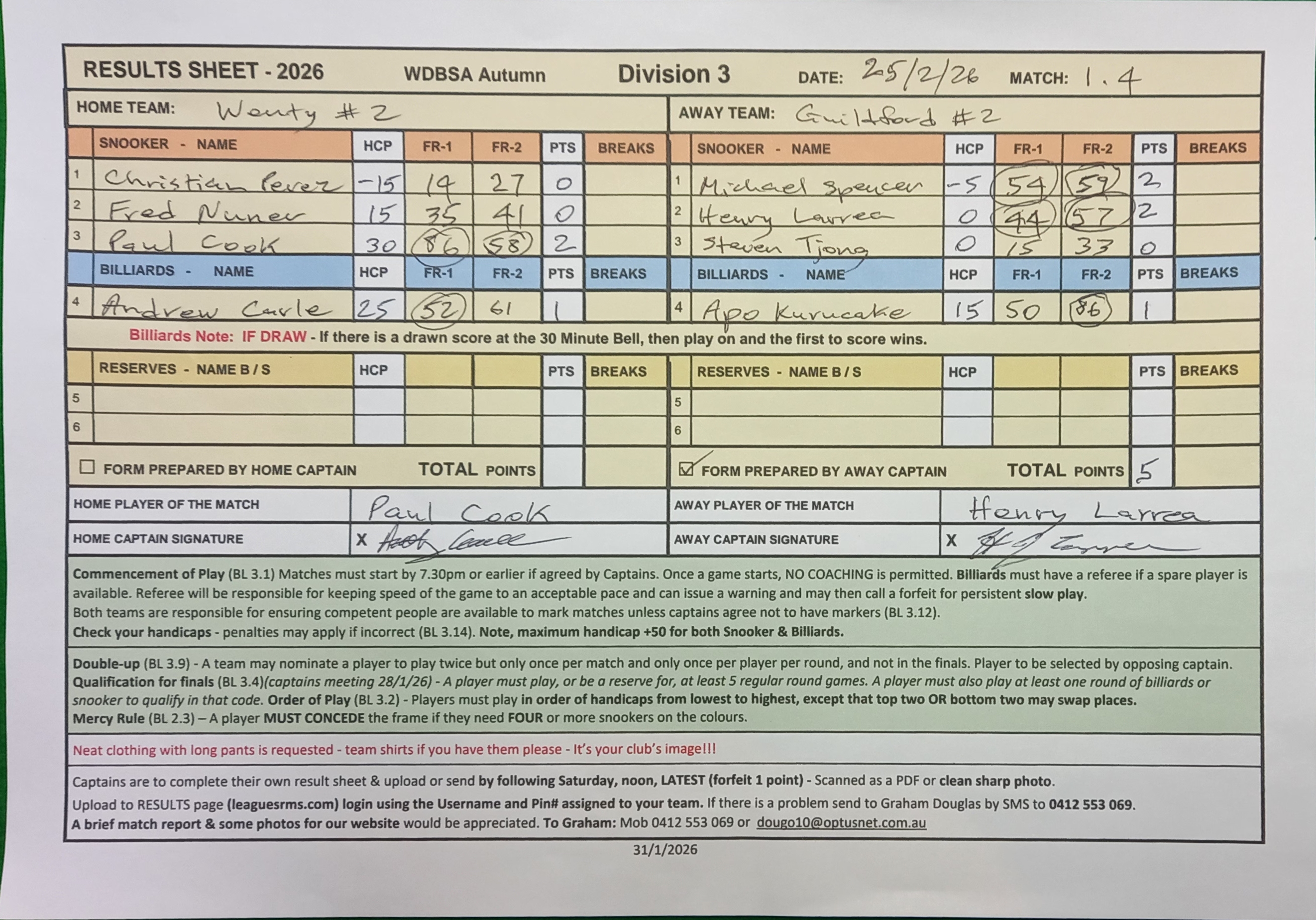 | POS | Wenty #2 | Frame 1 | Net | Frame 2 | Net | PTS | Breaks | Guildford #2 | Frame 1 | Net | Frame 2 | Net | PTS | Breaks | Result Note | Updated on | Update by |