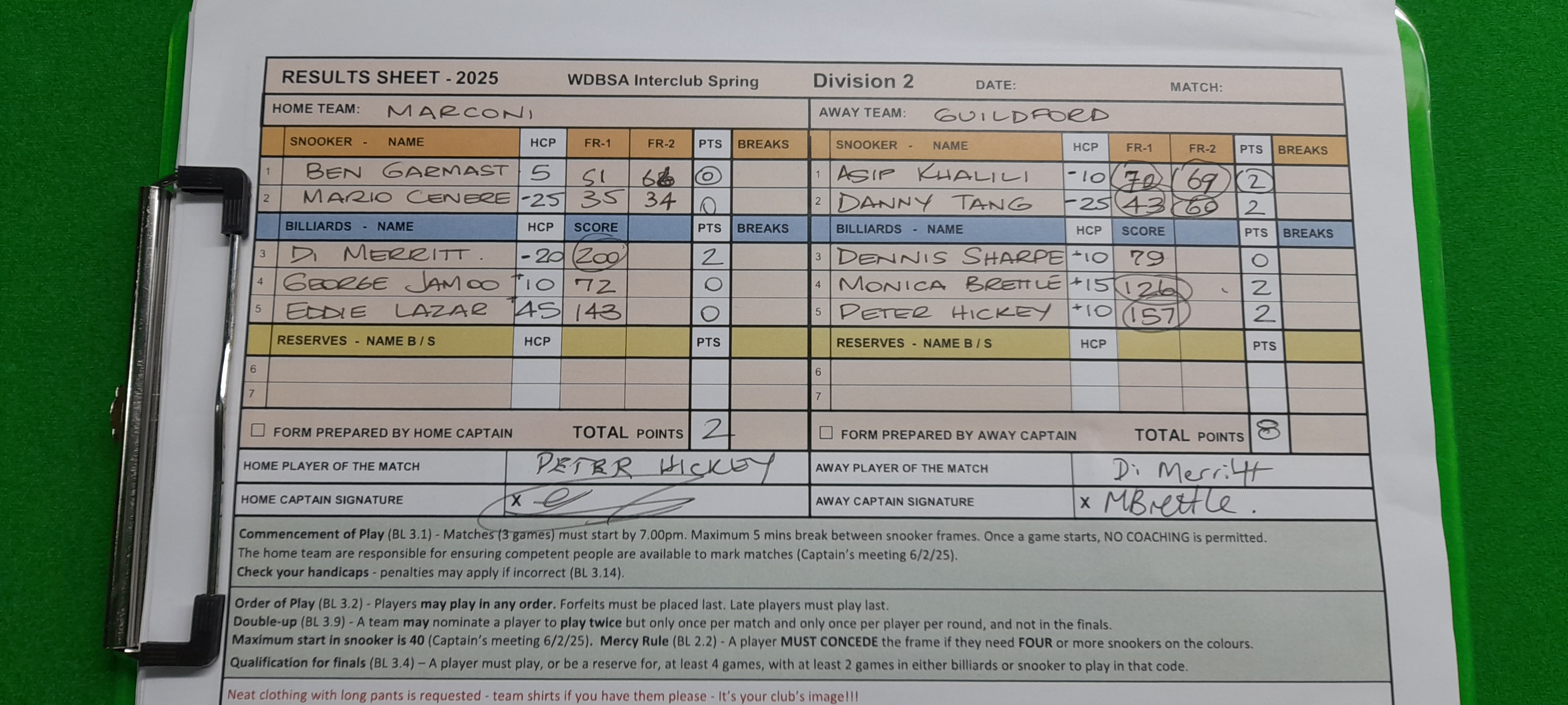 | POS | Marconi | Score | Net | PTS | Break | Guildford | Score | Net | PTS | Breaks | Result Note | Updated on | Update by |