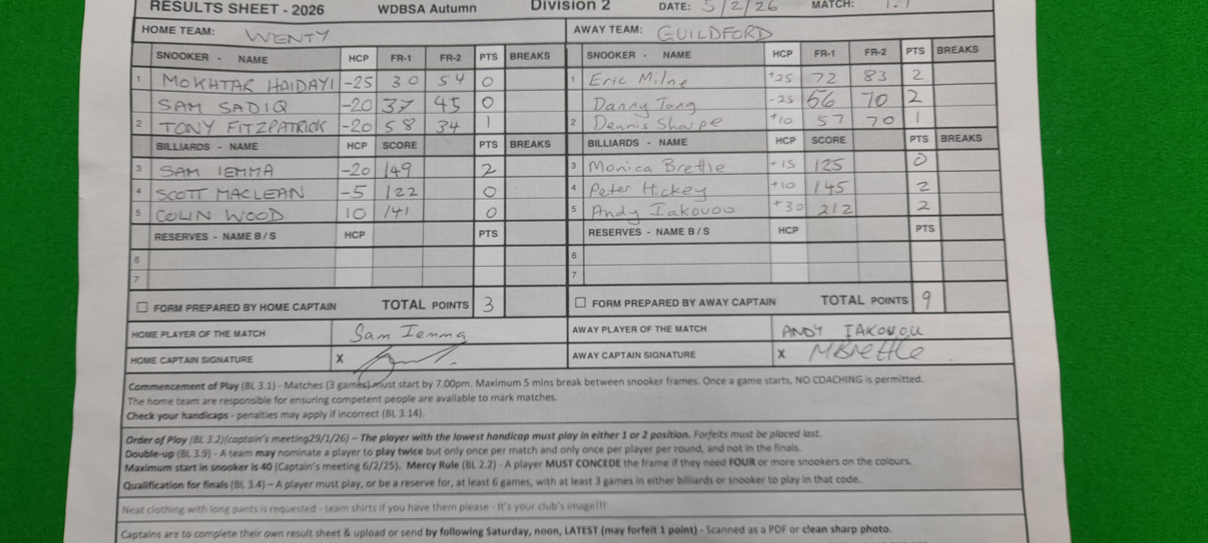 | Colin Wood (10) | Andy Iakovou (30) | 2026-02-05 21:59:20 | Guildford |