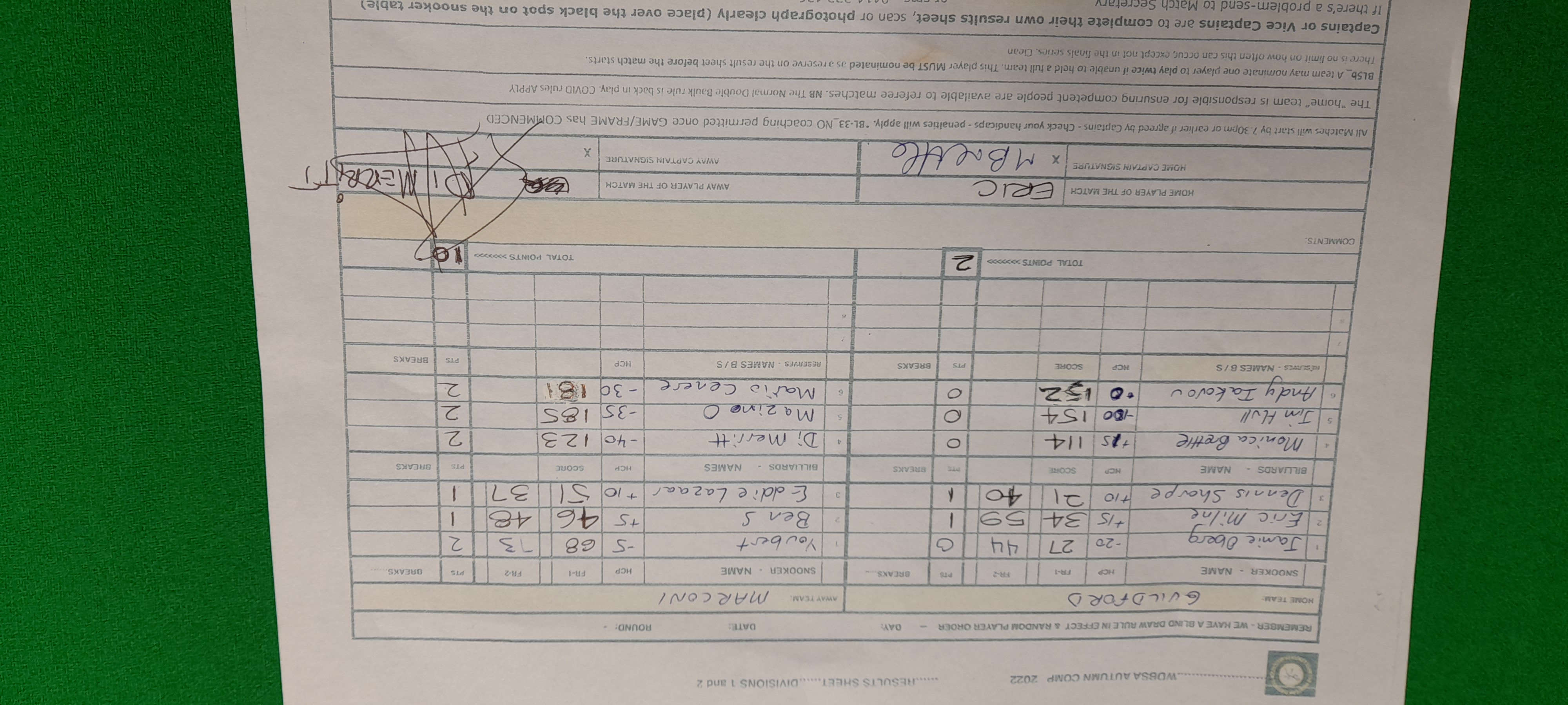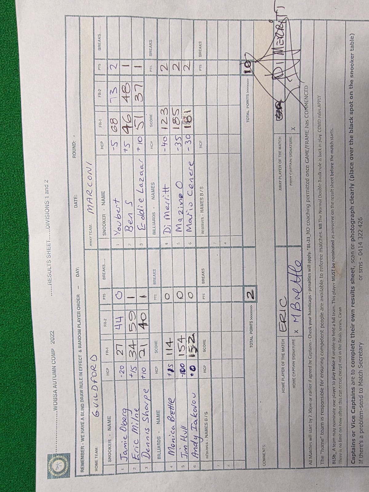 | POS | Guildford | Score | Net | PTS | Break | Marconi | Score | Net | PTS | Breaks | Result Note | Updated on | Update by |
