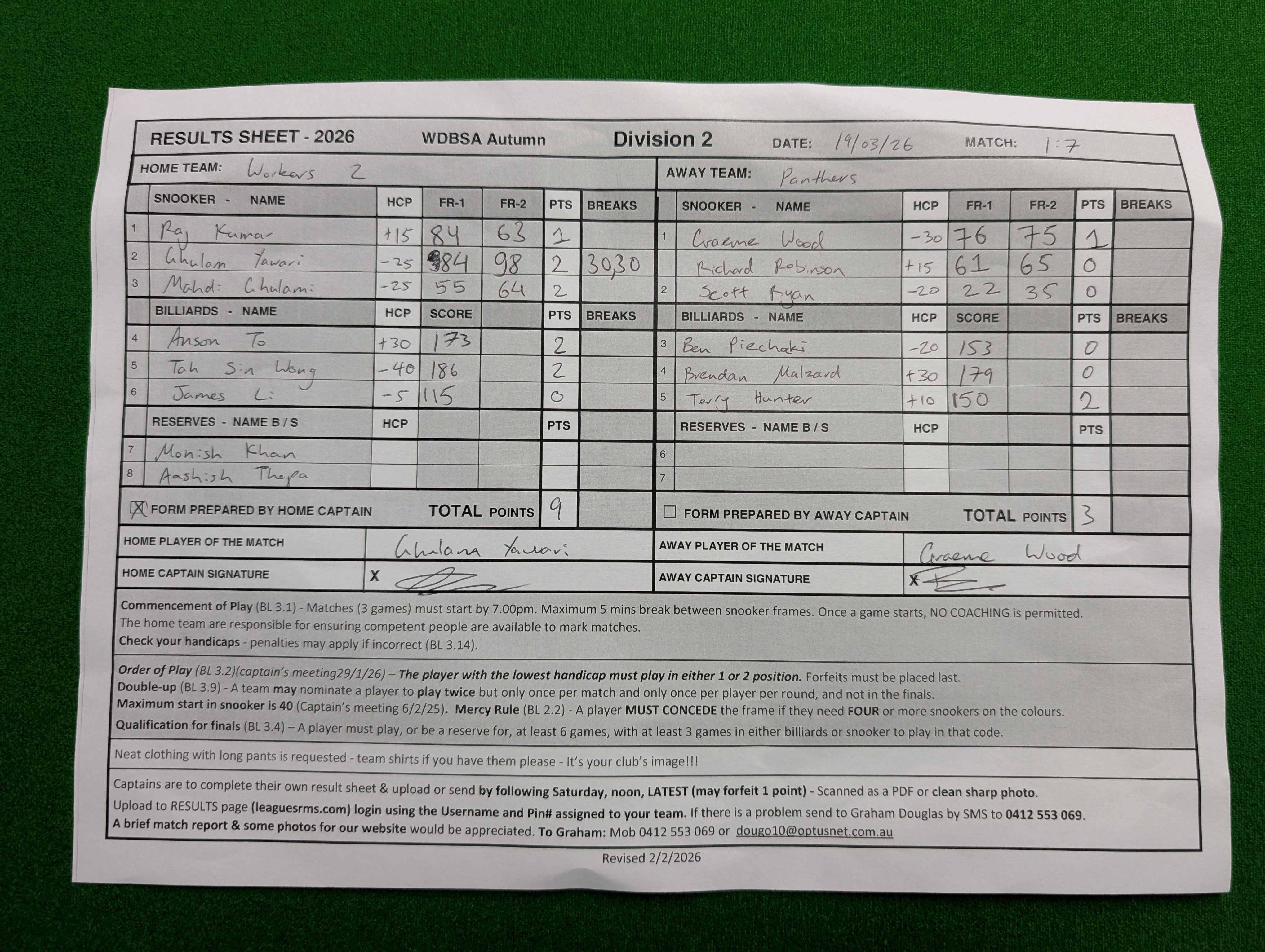 | POS | Workers #2 | Frame 1 | Net | Frame 2 | Net | PTS | Breaks | Panthers | Frame 1 | Net | Frame 2 | Net | PTS | Breaks | Result Note | Updated on | Update by |