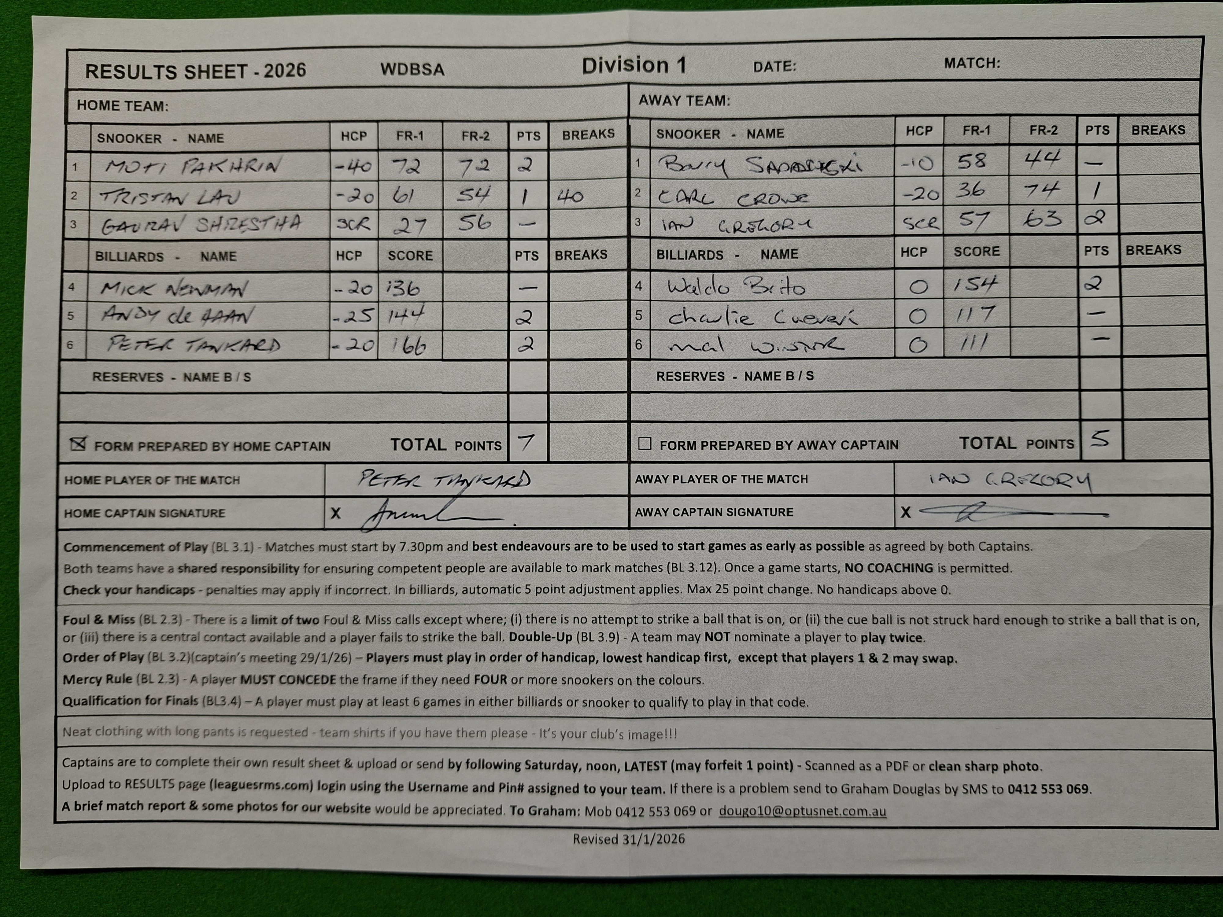 | POS | Hornsby | Frame 1 | Net | Frame 2 | Net | PTS | Breaks | Condell Park | Frame 1 | Net | Frame 2 | Net | PTS | Breaks | Result Note | Updated on | Update by |